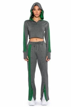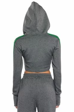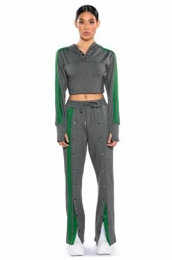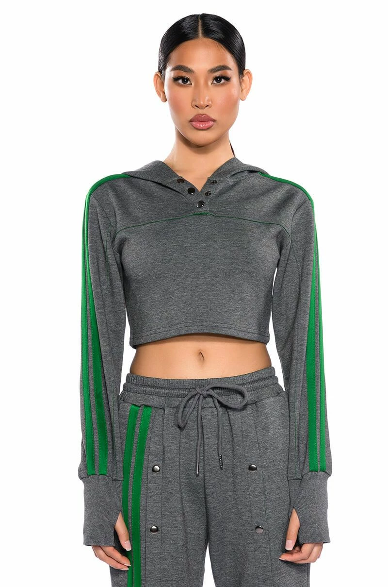The AKIRA Label Acquainted Cropped Hoodie is made from a slick sweatshirt fabrication and features an attached hood, long sleeves with colorblock stripe detailing, long ribbed knit wrists with thumbholes, contrast stitching, a cropped silhouette, satiny lining, and snap button front closures. Pair this piece with the coordinating AKIRA Label Acquainted Snap Front Wide Leg Sweatpant and chunky sneakers to complete your fresh athleisure look.