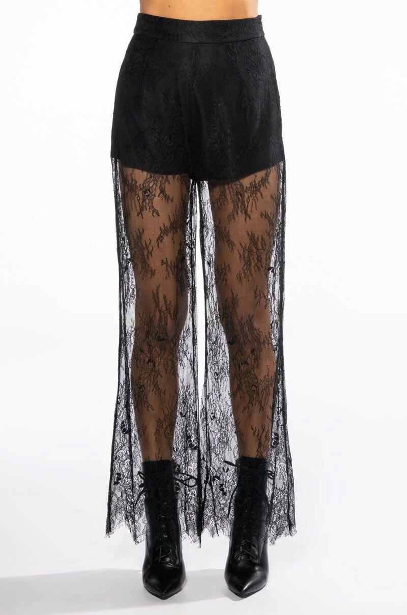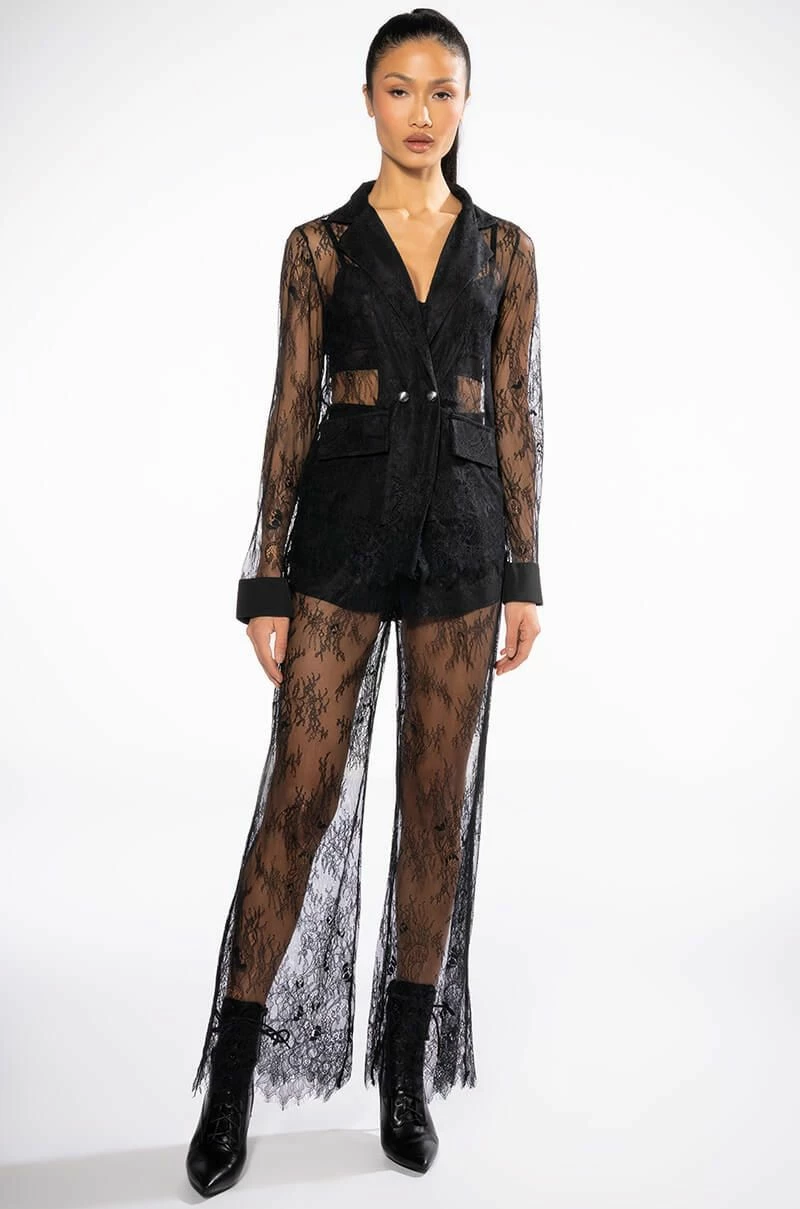 The AKIRA Label All Over Lace High Waist Wide Leg Trouser feature a sheer lace fabrication, a high rise waist, a wide waistband, smooth inner shorts, wide pant legs, and a concealed back zipper closure.Pair with the coordinating AKIRA Label All Over Lace Blazer.