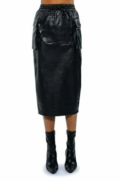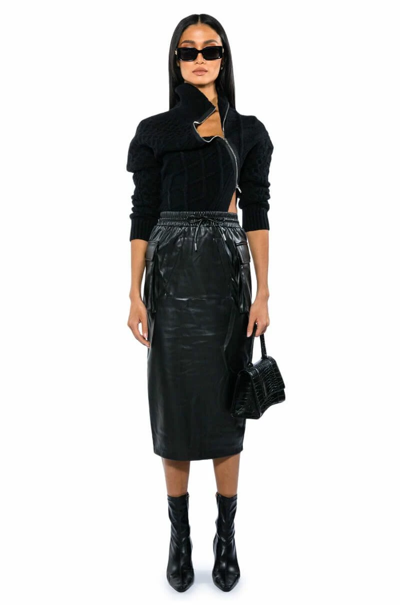 The AKIRA Label Begin Again Faux Leather Midi Skirt features a wide smocked elastic waistband, cargo style side pockets, and a front kangaroo pouch pocket. Complete with silver capped waist drawstrings and a vented back slit for easy movement. Dress it up with a sexy crop tank and a pair of stiletto heel ankle booties for a night out and about.