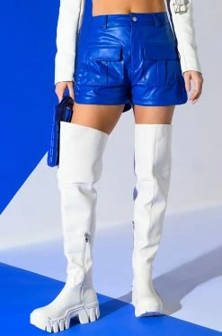 The AKIRA Label Cora Pocket Detail Faux Leather Short features a vegan leather fabrication, a high rise waistline, flap front cargo pockets, flap faux back pockets, a curved hemline, and a button up and zipper closure.