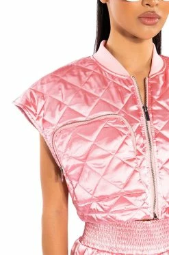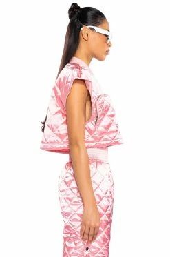 The AKIRA Label Cozy Mode Quilted Satin Vest in Pink is a cropped layering piece featuring a quilted satin base, a classic sleeveless cut, zip front pockets, and a ribbed knit standing collar. Complete with a smooth inner lining, silver hardware, and a front zipper closure. Pair with the coordinating AKIRA Label Cozy Mode Quilted Satin Breakaway Jogger in Pink for a fresh fit.