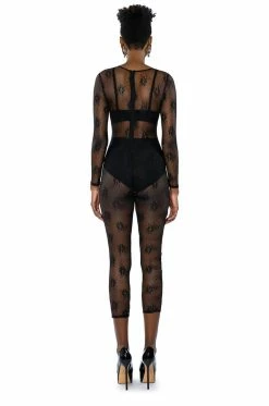 The AKIRA Label Day By Day Lace Jumpsuit And Twist Front Maxi Skirt Set is made from a sheer floral lace fabrication and features: a jumpsuit with a high, rounded neckline, long sleeves, a skinny leg fit, and a tonal back zipper closure. Also included is a coordinating lace skirt with a twist front waist detail, a sexy front slit, a maxi length silhouette, and a pull-on fit to layer over the jumpsuit with ease. Shown undergarments not included.