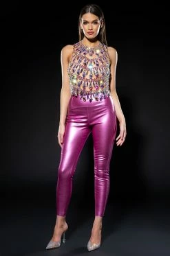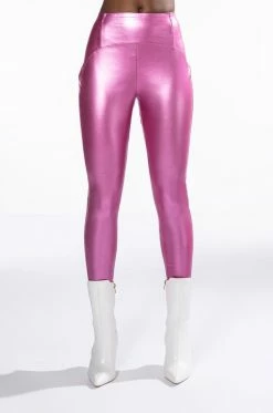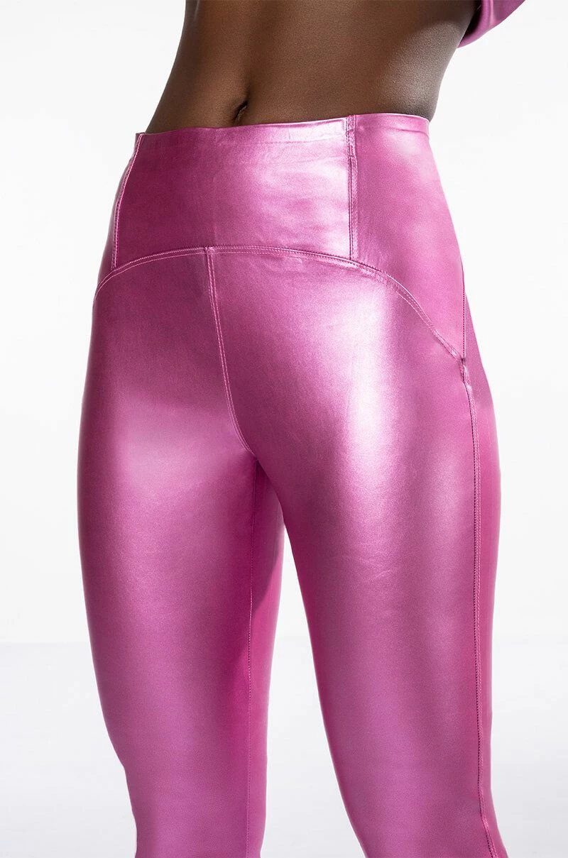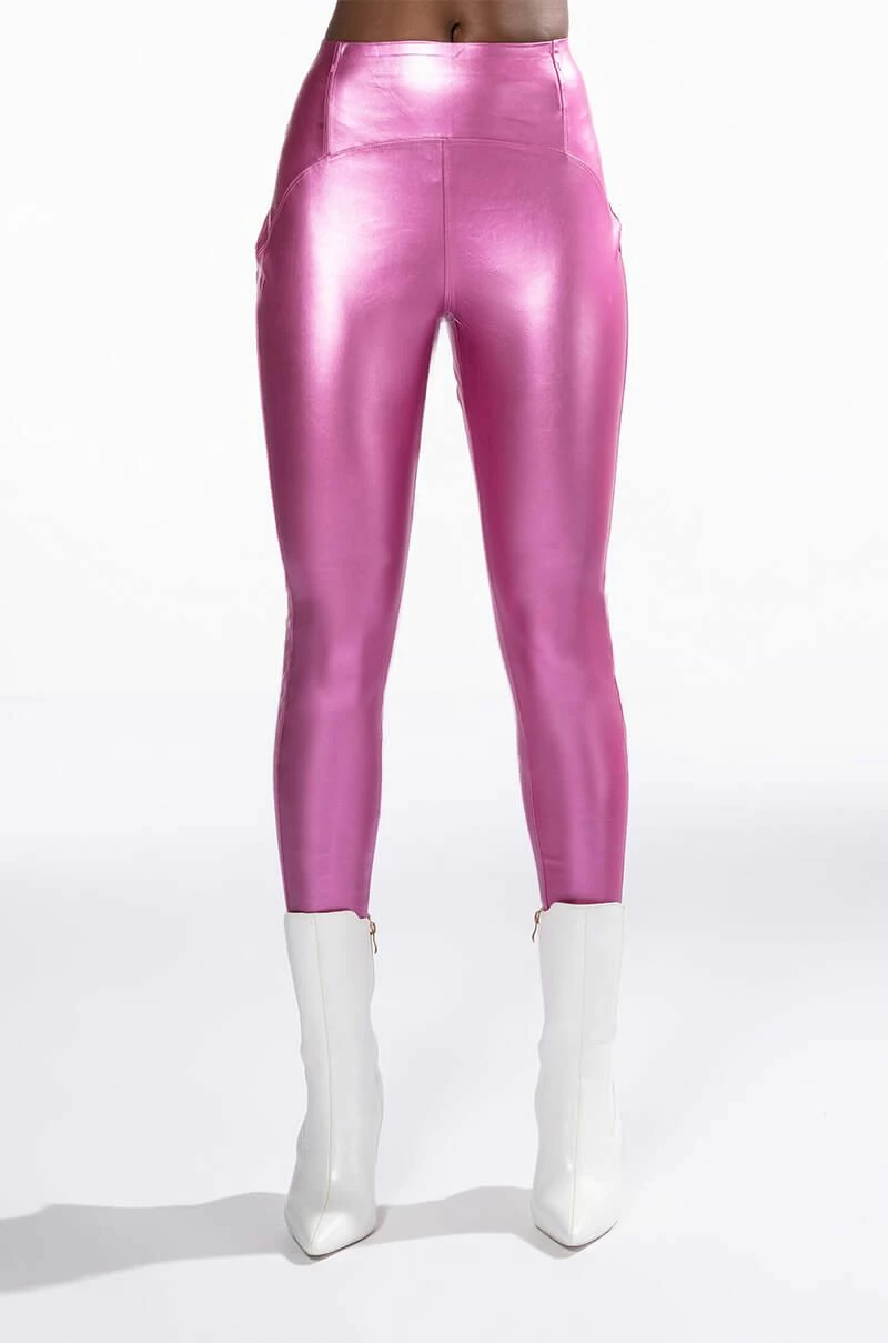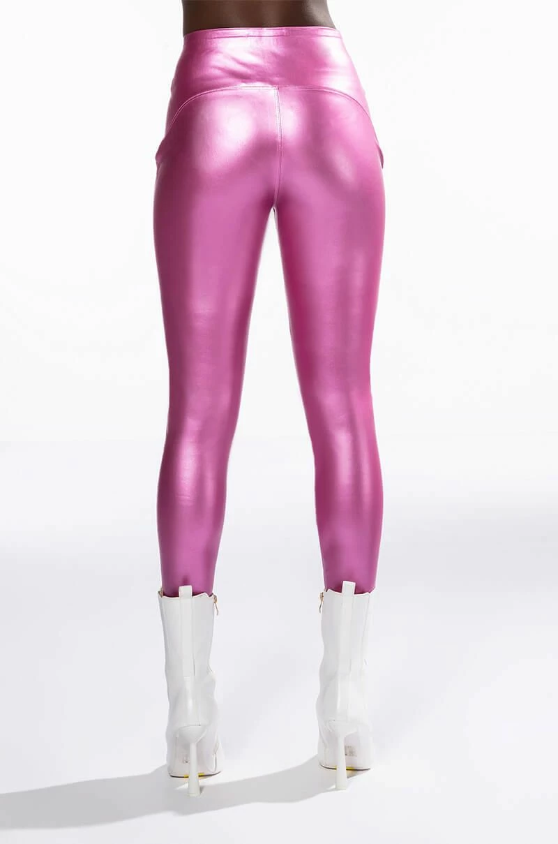 The AKIRA Label Daytime Disco Faux Leather Legging is made from a pebbled, metallic faux leather fabrication and features a high rise waist with an elastic waistband, paneled stitching, a skinny leg fit, and a pull-on design. Pair this piece with the matching AKIRA Label Daytime Disco Metallic Faux Leather Button Down to complete your look.