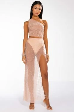 The AKIRA Label Disco Doll Embellished High Slit Mesh Maxi Skirt is made from a sheer mesh fabrication and features a high rise waist with a wide elastic waistband, a maxi length silhouette, a sexy high side slit, and cheeky inner panties with a gusset closure. Pair this glimmering piece with the coordinating AKIRA Label Disco Doll Embellished One Shoulder Mesh Crop Top to finish off your dance floor-worthy look!