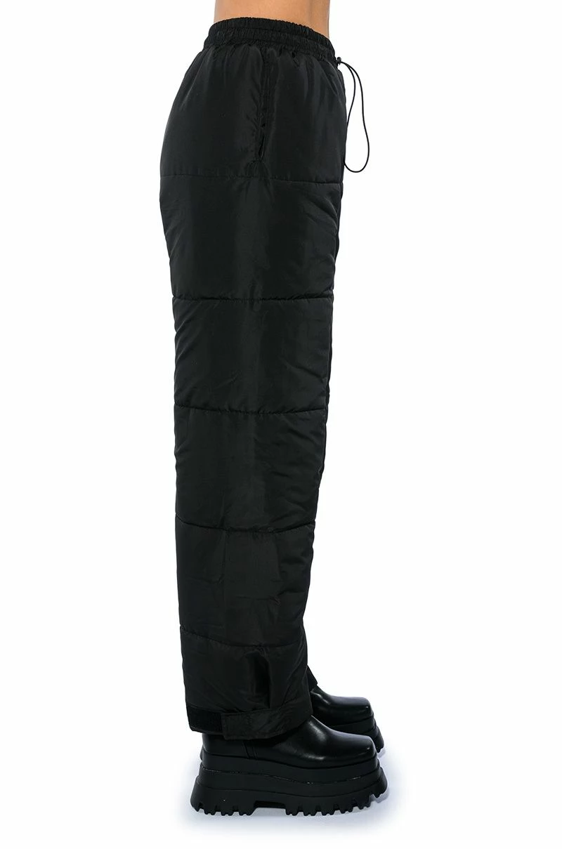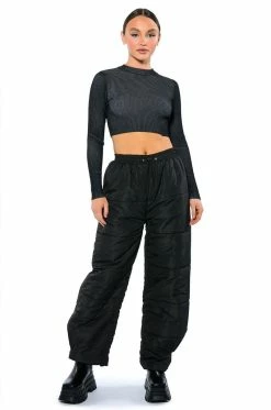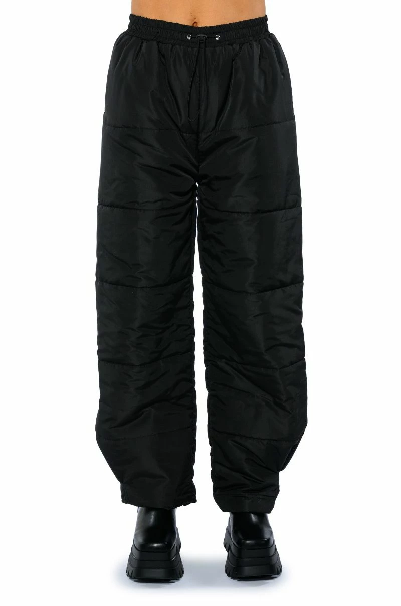 The AKIRA Label Double Up Puffer Pull On Jogger is made from a slick fabrication and features a high rise waist, a ruched elastic waistband with toggle drawstring detail, slant side pockets, wide puffer pant legs, and velcro ankle hems. Pair this piece with a mock neck sweater and furry booties to complete your cozy cute look.