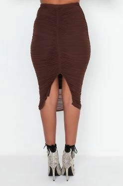 The AKIRA Labe Drama Free Ruched Midi Skirt features a lined mesh fabrication, all-over ruched body, elastic waistband, bodycon midi silhouette, and a subtle back slit. Complete your set with the matching AKIRA Label Drama Free Cinched Mesh Blouse.