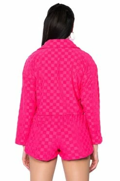 The AKIRA Label Easy Days Zip Up Jacket is part of an uber cute two piece set, made from a checkered terry cloth base fabrication and featuring a pointed fold over collar, long wide sleeves, a boxy, cropped silhouette, and zipper front closure. Style with the matching bottoms, The AKIRA Label Easy Days Pull On Short, and The Snowbell Patent Cold Weather Boot In Pink for a cozy, chic look.