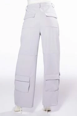 The AKIRA Label Elevated Cargo Pants In Light Grey are an elegant take on the cargo pant trend featuring a soft scuba knit base, a high rise waist, functioning belt loops, faux button front slant side pockets, flap front cargo back pockets, and coordinating flap front ankle cargo pockets at the front and back. Complete with a wide leg silhouette, zippered side slit hem detailing, and a zip button front closure.