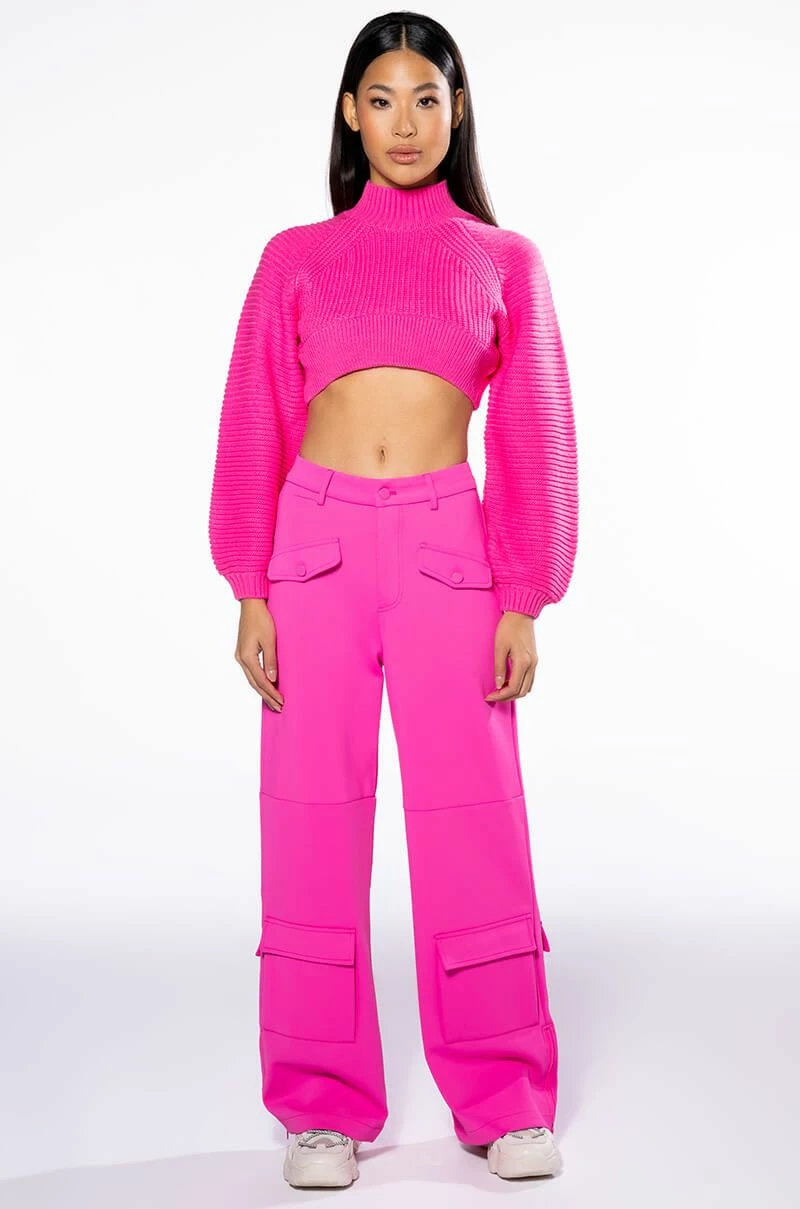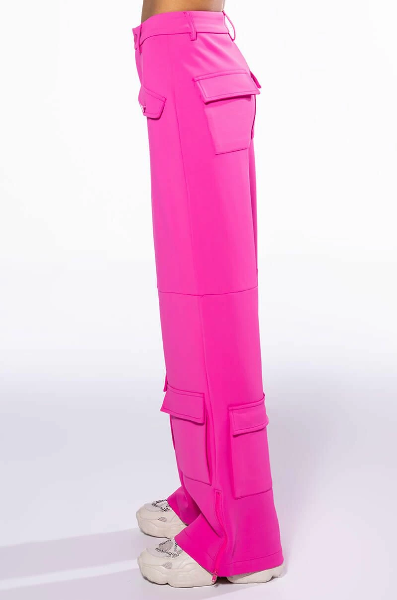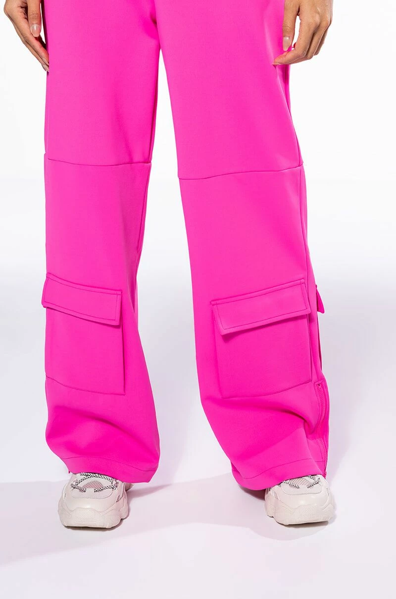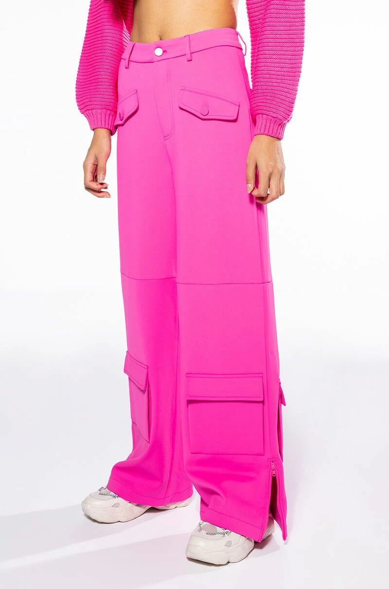 The AKIRA Label Elevated Cargo Pants In Pink are an elegant take on the cargo pant trend featuring a soft scuba knit base, a high rise waist, functioning belt loops, faux button front slant side pockets, flap front cargo back pockets, and coordinating flap front ankle cargo pockets at the front and back. Complete with a wide leg silhouette, zippered side slit hem detailing, and a zip button front closure.