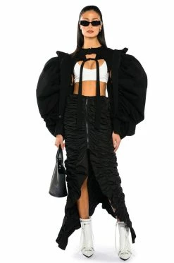 Steal the show with The Encore Scrunched Slit Maxi Skirt! This form-fitting maxi length skirt is made from a polyester and cotton fabrication, featuring a smocked elastic waist line, all over ruched detailing, a tonal side zipper closure, and a thigh-high scrunched side split. Pro tip: switch the side split and zipper to the back for a sexy ruched look! Pair this piece with a cropped top and chunky heeled boots to complete your effortless look.