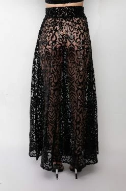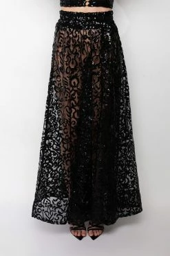 The AKIRA Label Estelle Sequin Maxi Skirt features a structured yet sheer tulle base, maxi silhouette, and an off center high slit. Complete with an elasticized waistband for an hourglass cut and sequin brocade detailing. Pair this piece with the coordinating Estelle Sequin Blouse, a sleek bodysuit, and a PVC pump.