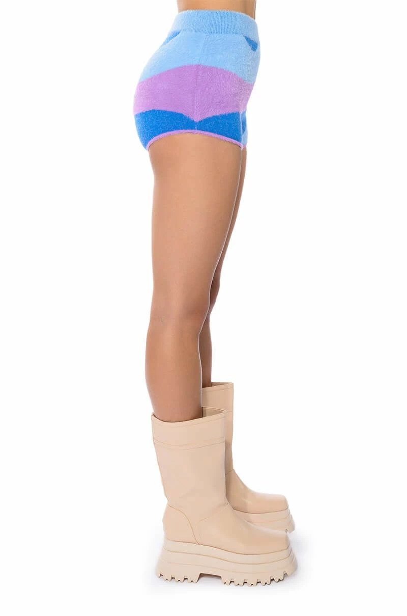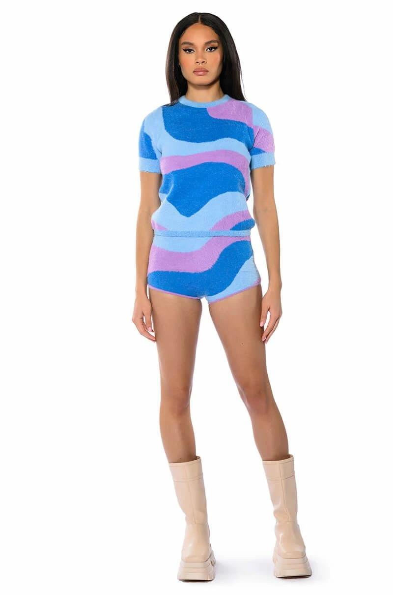 The AKIRA Label Far Out Knit Hot Pants feature a leg-baring, mini hem, a high rise silhouette, and a fuzzy knit fabrication. Complete with an abstract print pattern and a wide elastic waistband. Pair with the coordinating AKIRA Label Far Out Short Sleeve Sweater and the Far Out Tie Cardigan.