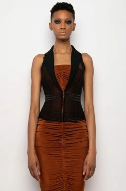 Steal the style spotlight with The AKIRA Label Fashion Heist Mesh Corset Vest. This sheer mesh piece features a sleeveless design, a collared neckline, a longline silhouette, and hook and eye front closures. Complete with satin piping, structured boning, and a nipped in waist. Style it with your fave mini dresses and square toe sandals for a complete look.