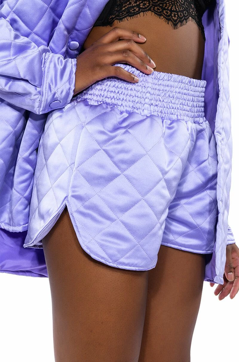 Make your dreams reality in The AKIRA Label Field Of Dreams Satin Quilted Shorts. This fresh take on the classic lounge short features a plush quilted satin fabrication, a cinched elastic high rise waist, and subtle side slits. Complete your look with the coordinating AKIRA Label Field Of Dreams Satin Quilted Shacket.