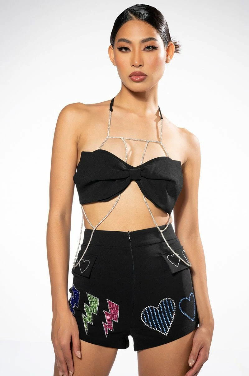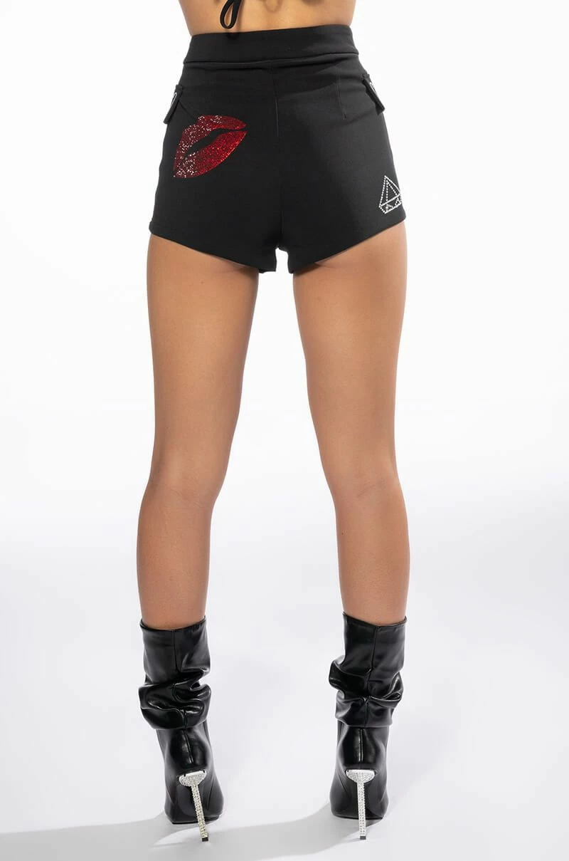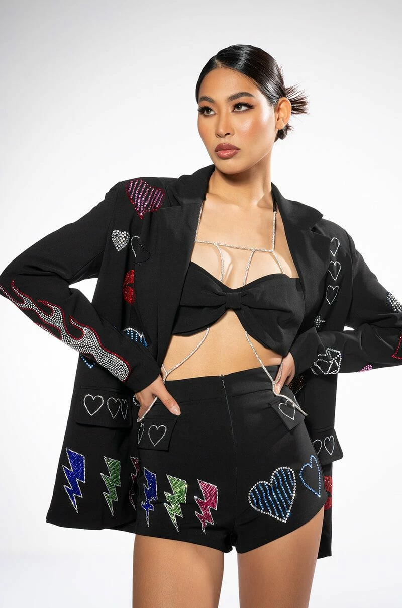 The AKIRA Label Flashing Lights Rhinestone Embellished Booty Short is made from a lightweight fabrication and features multicolor emoji-shaped rhinestone embellishments, a high rise waist, a wide waistband, mock front flap pockets, and a tonal front zipper closure. Pair this piece with the matching AKIRA Label Flashing Lights Rhinestone Embellished Blazer and Flashing Lights Rhinestone Rope Bralette to complete your look.