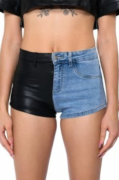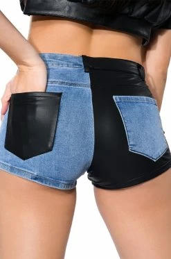 You get the best of both worlds with The AKIRA Label Flex Fit Extreme Stretch Faux Leather And Denim Shorts! These ultra-stretchy denim bottoms feature a curve-hugging stretch denim knit construction, a high rise waist, a faux leather leg and back pocket, a classic zip button closure, and functioning belt loops. Style with your fave graphic crop tops and sleek ankle booties for a casual moment that puts your sexy self front and center.