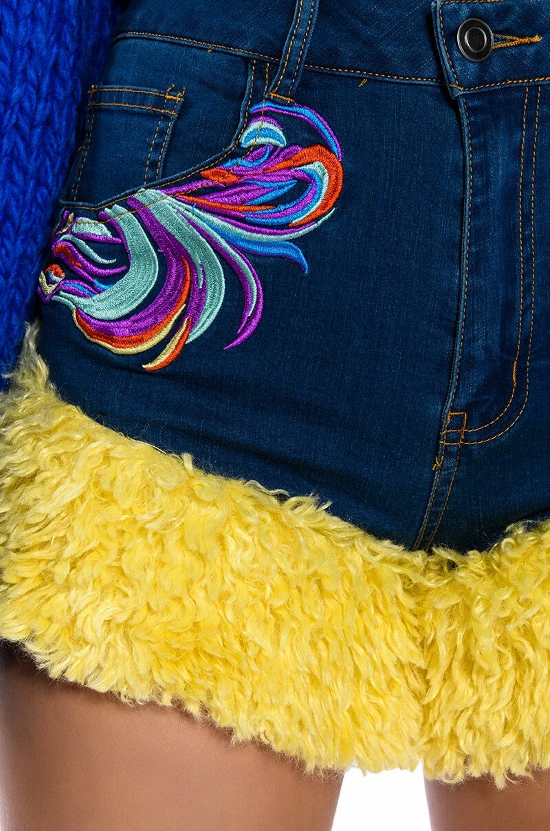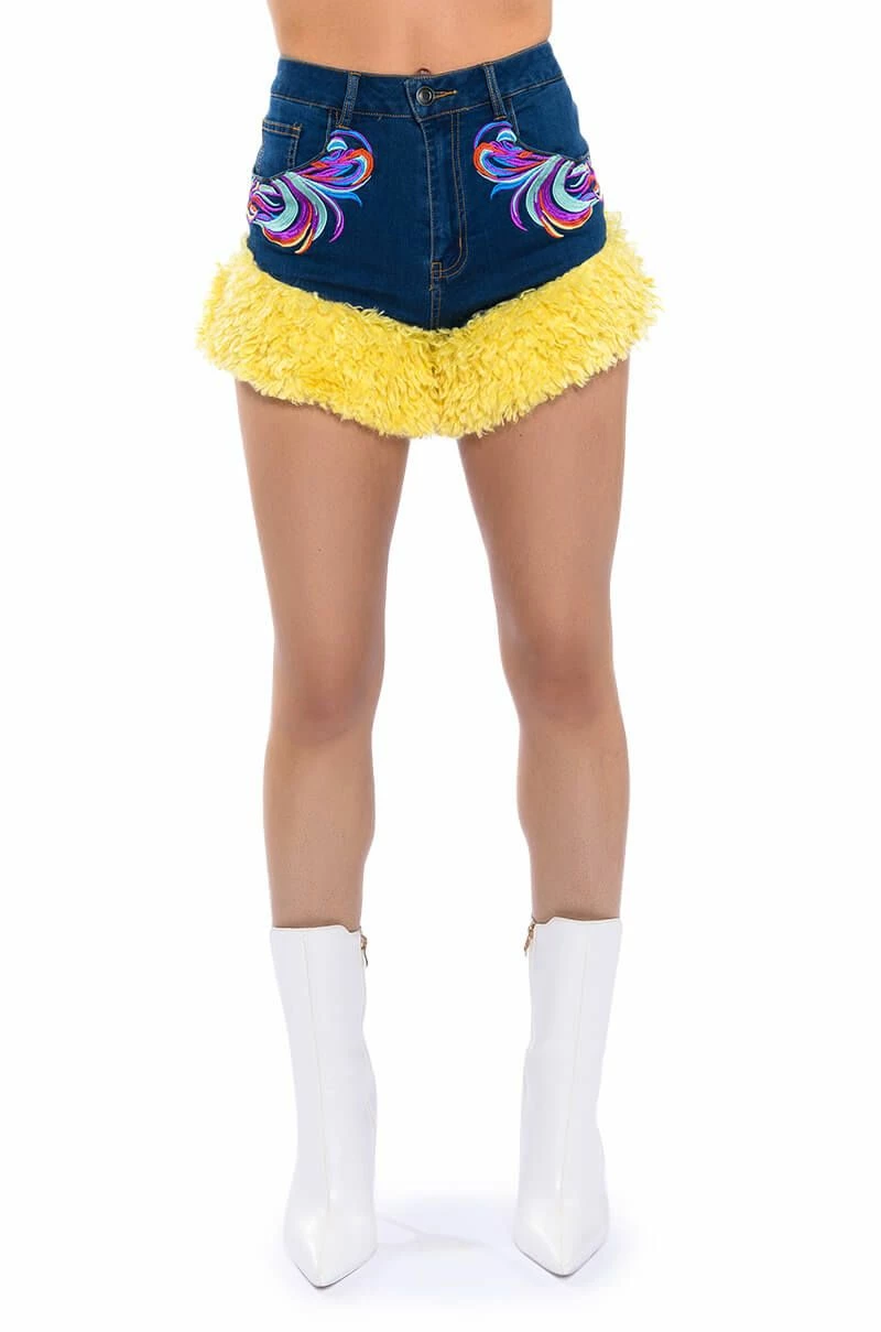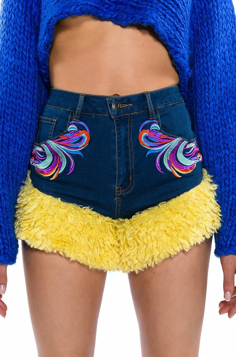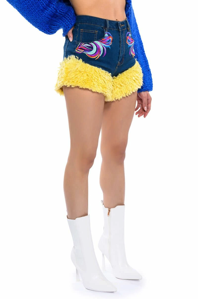Weβre crushing on The AKIRA Label Fun With Me Denim Shorts. These denim bottoms feature a mid rise waist, a classic zip button closure, shearling bottom hem detailing, and colorful embroidery detail on the front pockets. Complete with a functional four pocket design and working belt loops. Style with your fave nude bodysuits and slip on mules.