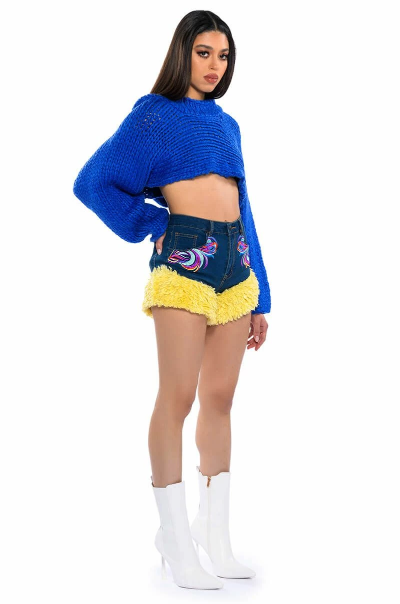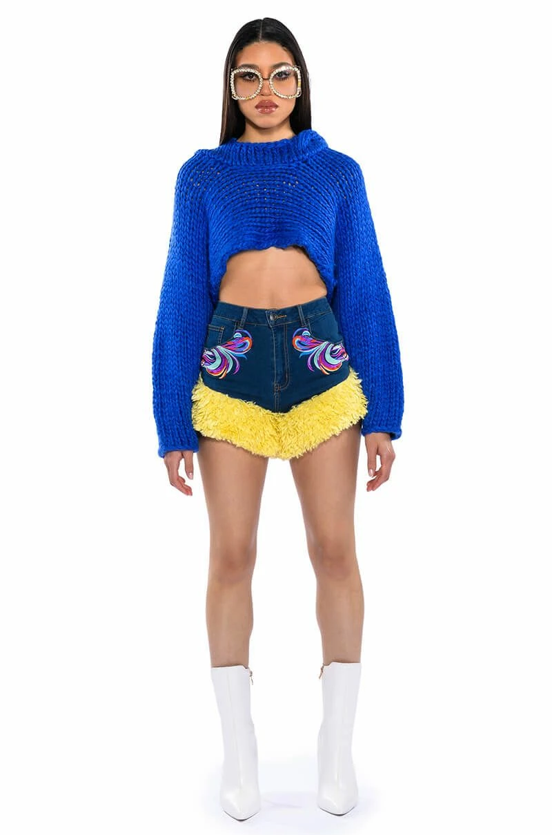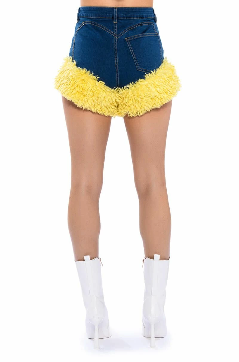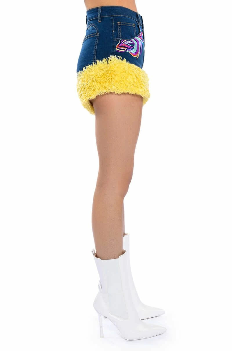 Weβre crushing on The AKIRA Label Fun With Me Denim Shorts. These denim bottoms feature a mid rise waist, a classic zip button closure, shearling bottom hem detailing, and colorful embroidery detail on the front pockets. Complete with a functional four pocket design and working belt loops. Style with your fave nude bodysuits and slip on mules.