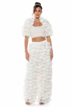 The AKIRA Label Garden Of Eden Applique PantsIn White are giving eleganza, darling. These bold and flowy bottoms are made from a mesh base fabrication and features beautiful, floral chiffon and feather appliques throughout, a ruched elastic waist, high rise silhouette, and wide legs. Complete with a smooth, satin inner lining and a pull-on fit. Style with a matching floral applique top, The AKIRA Label Garden Of Eden Applique Bomber, and pumps for a chic, effortless look!