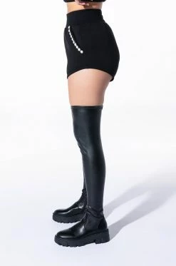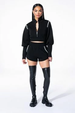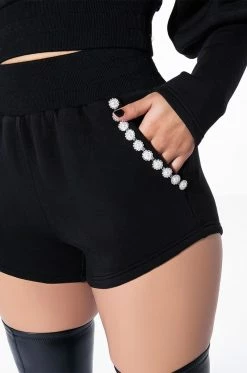 Cozy and glam go hand in hand with The AKIRA Label Gemini Pearl Detail Scuba Booty Short. These cheeky dolphin shorts feature a plush yet structured knit fabrication, a high rise waist, a wide elastic waistband, rhinestone and pearl trim slant side pockets, and a pull-on silhouette. Pair this piece with the matching AKIRA Label Gemini Gemini Pearl Detail Front Zip Scuba Sweatshirt to complete your blinged-out look!