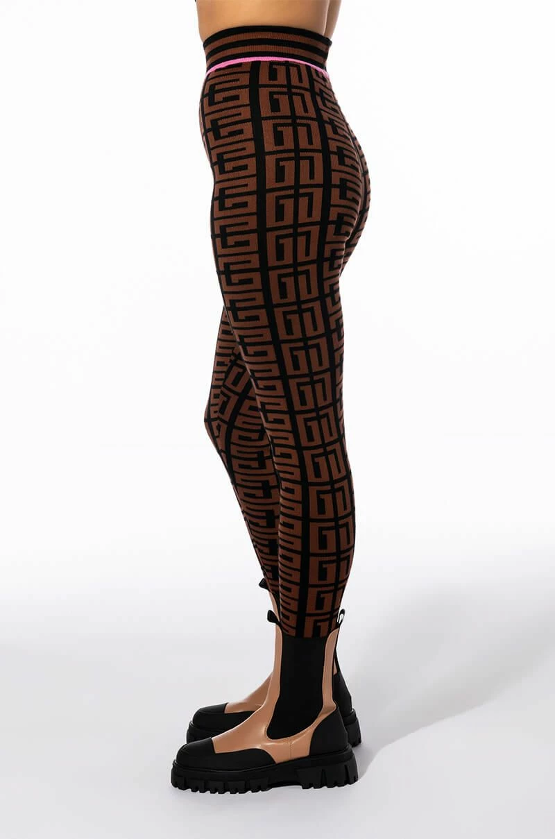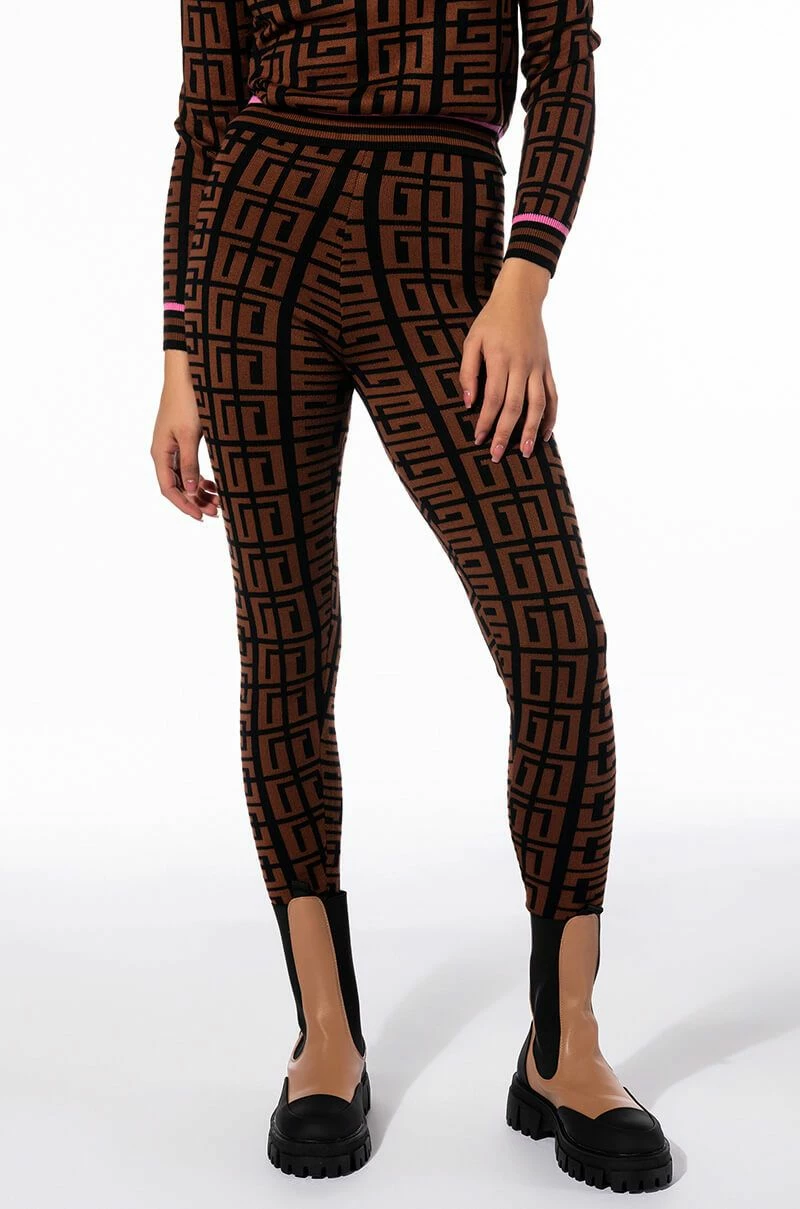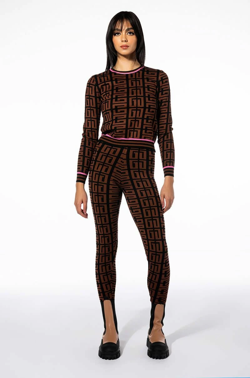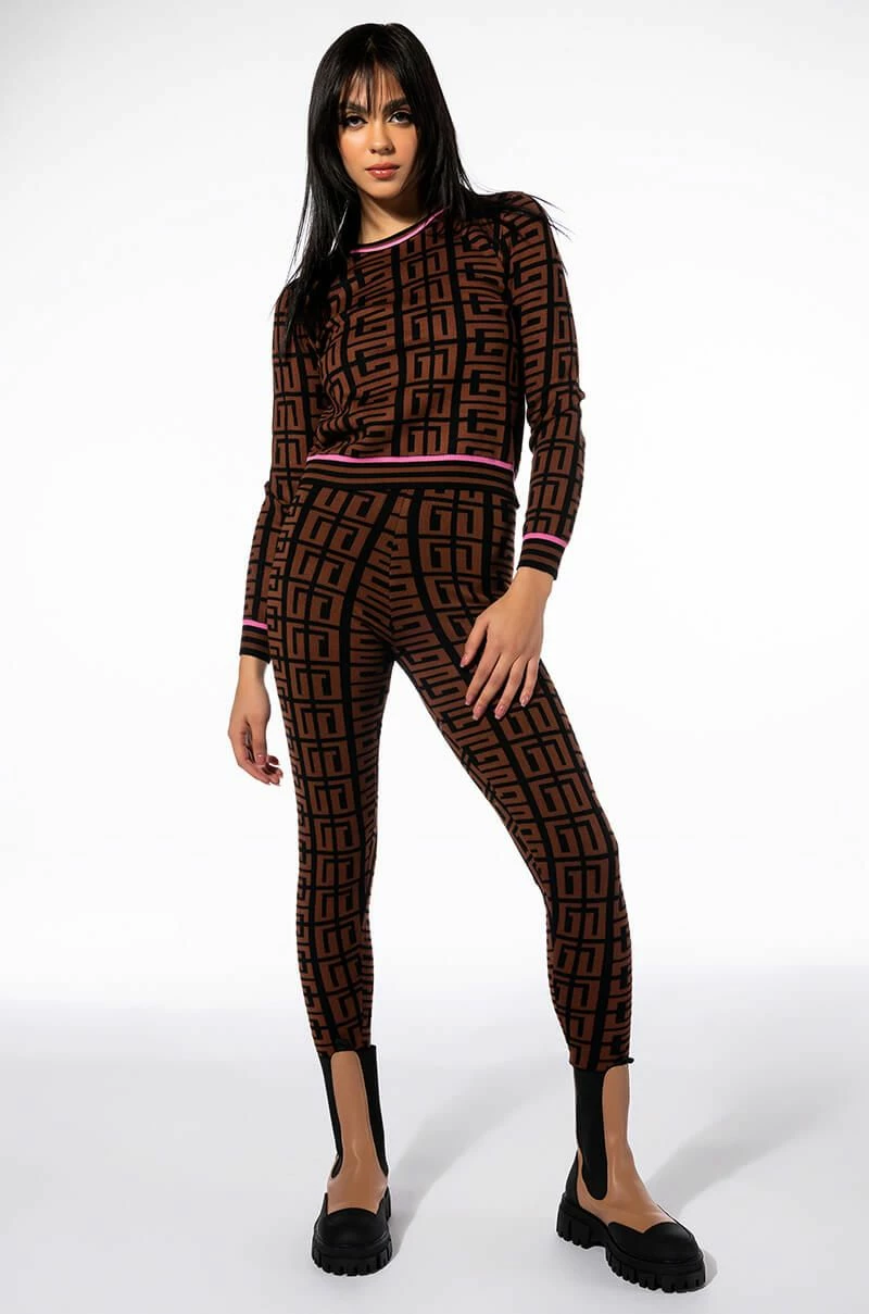 Graphic glam meets cozy chic with Try The AKIRA Label Get In Line Sweater Legging. This classic loungewear piece features a knit base, high waist rise, elastic waistband, bodycon fit, ribbed knit hems, and a geometric print. Pair with the coordinating AKIRA Label Get In Line Crewneck Sweater and chunky sneakers to complete the look.