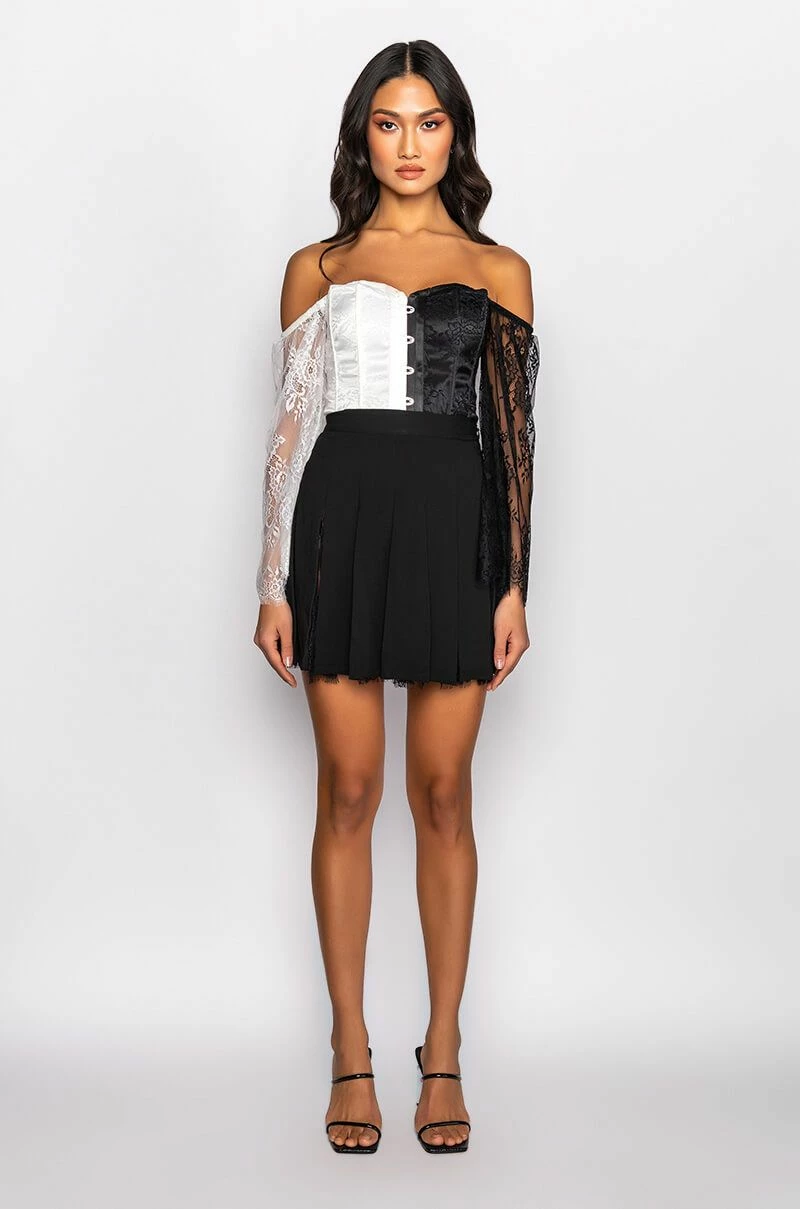 The AKIRA Label Ginger Lace Pleated Mini Skirt features a classic stretch knit fabrication, a pleated design, lace cut out pleated panel detailing, a side zipper closure, and a high rise waistline. Complete your look with a cropped blouse and strappy sandals.