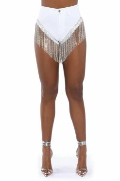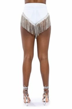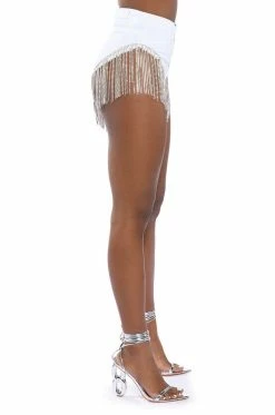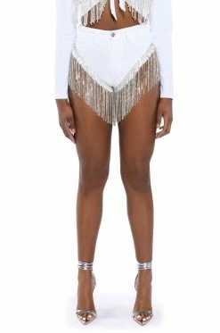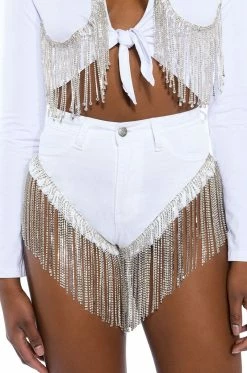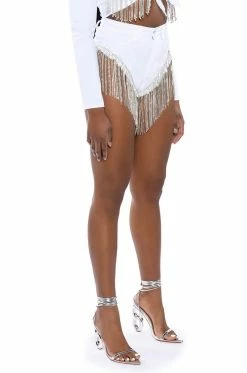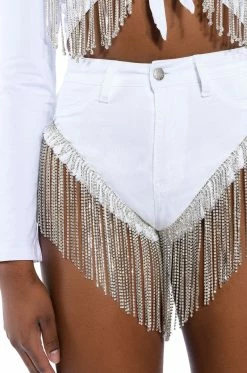 The AKIRA Label Gonna Love Me Waterfall Rhinestone Denim Short is a high cut, ultra-glam cheeky denim bottom complete with a high rise waist, belt loops, mock front pockets, back pockets, and fringe hem detailing. Complete with rhinestone fringe hem detailing and a classic front button fly closure.