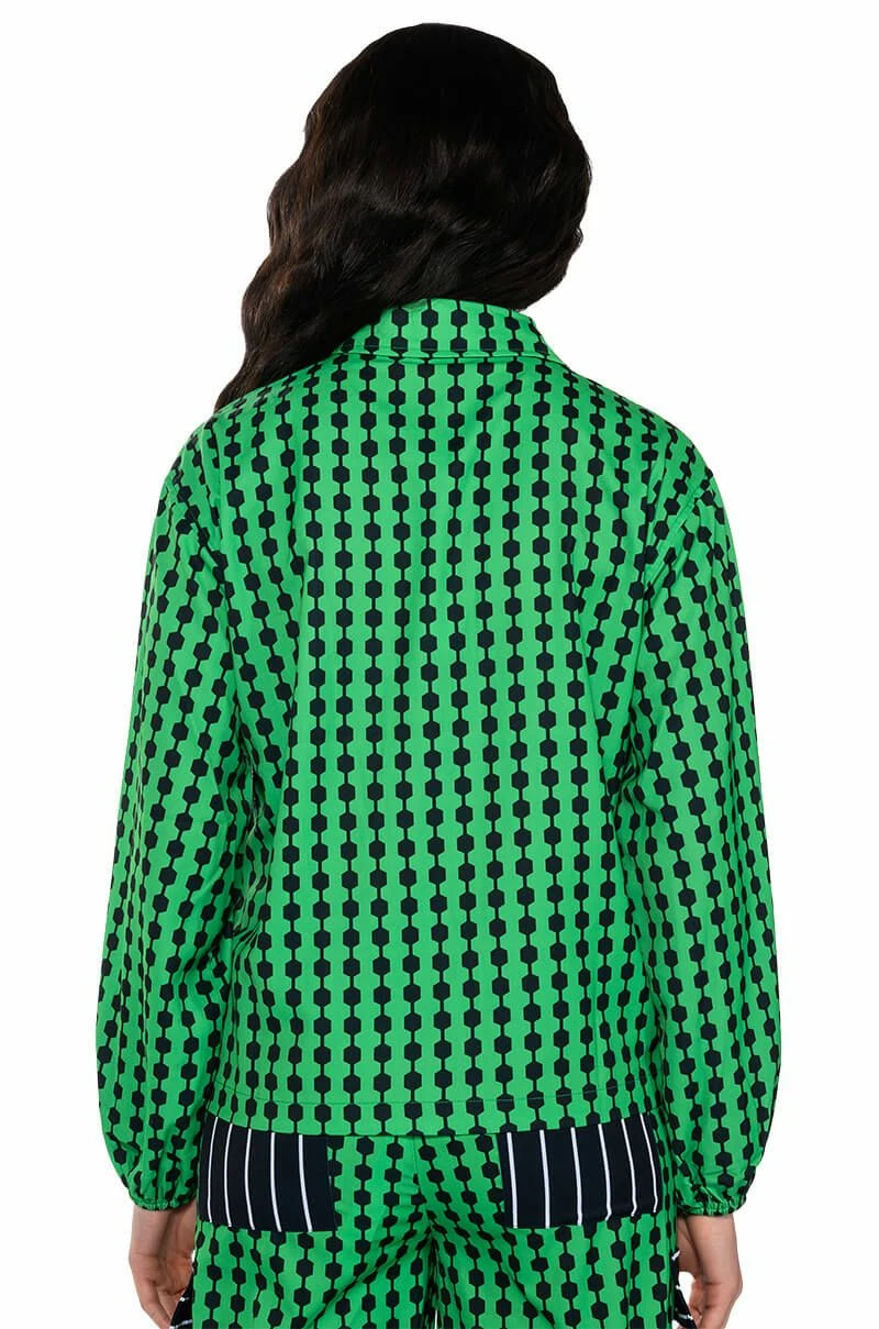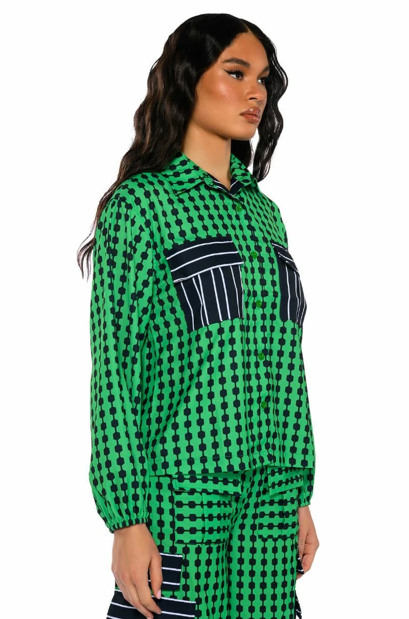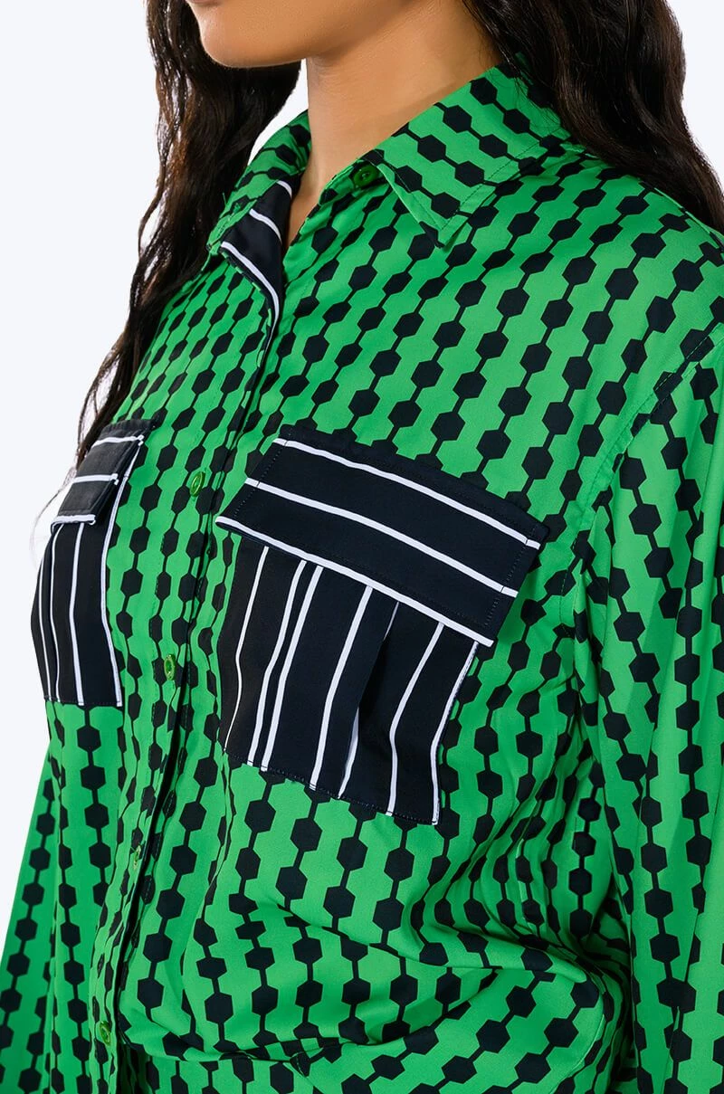 The AKIRA Label Patterns Please Button Down Blouse features a smooth, lightweight fabrication, geometric print patterning, and contrast stripe print flap front chest pockets. Complete with a fold over point collar, long sleeves, buttoned cuffs, and a button down front placket. Pair this bold top with the coordinating Patterns Please Jogger Pants for a bold look.