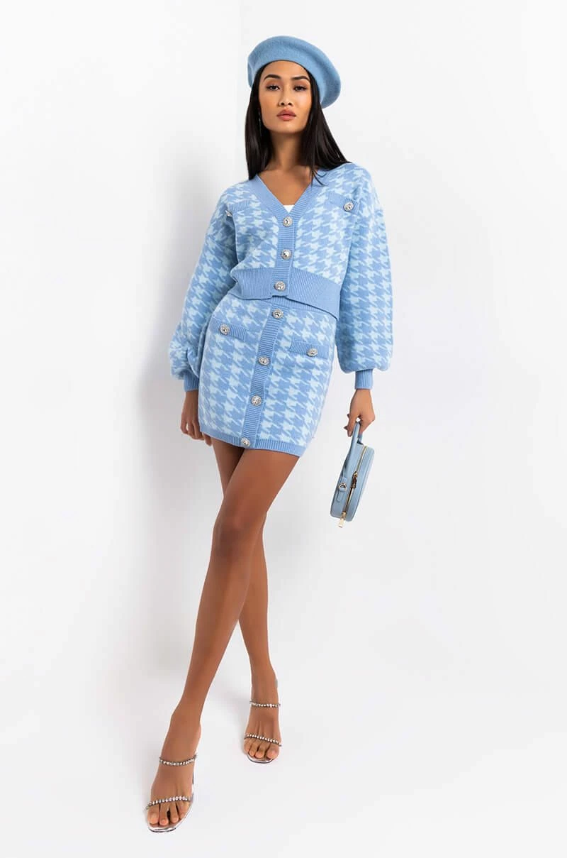 Youโre expensive, you know that? Not in a negative way. Change the connotation with The AKIRA Label High Maintenance Houndstooth Mini Skirt. This soft knit mini skirt features an elasticized waistband, ribbed knit trim, mini length, and bodycon silhouette. Complete with a faux button-front design, oversized metallic buttons, and houndstooth print throughout. Style with the coordinating High Maintenance Houndstooth cardigan and a chic quilted bag for a complete look.