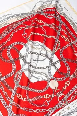 The AKIRA Label Holywood Red Satin Scar features an oversized square silhouette and a vintage inspired chain print pattern. Wrap this bold piece around your neck or purse, or wear it as a top!