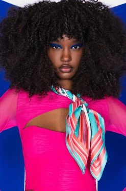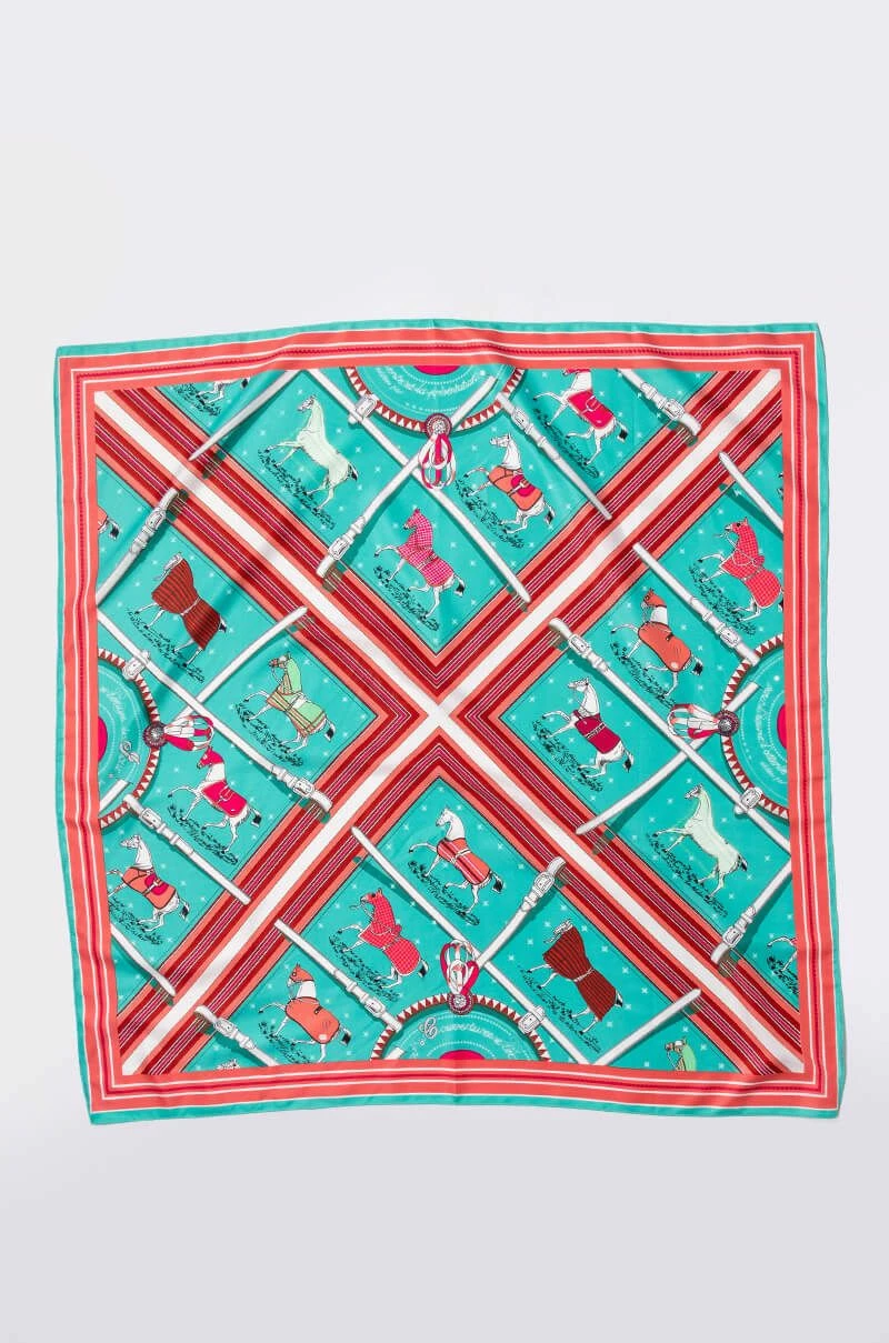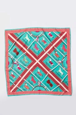 The AKIRA Label Horse Girl Teal Satin Scarf features a satin fabrication and a multicolor vintage-inspired print with whimsical horses and geometric details. Wrap it around your neck or purse, or wear it as a top!