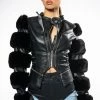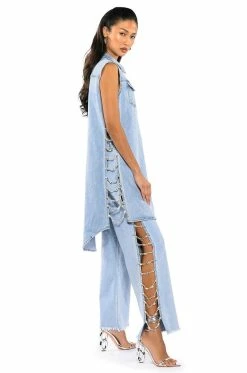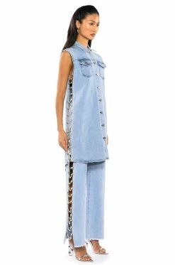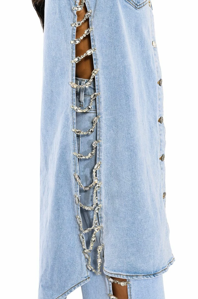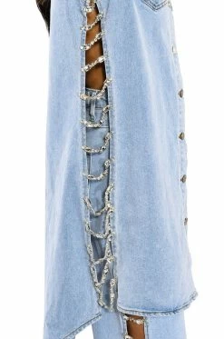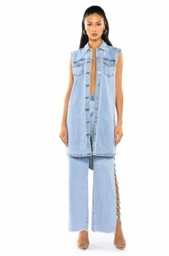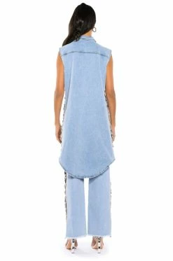 The AKIRA Label Houston Atlanta Vegas Rhinestone Trim Denim Vest features a classic cotton denim fabrication, a fold over collar, a sleeveless design, a button down front placket, and a longline silhouette. Complete with button front pockets, open sides, and rhinestone link detailing. Pair this unique piece with high waisted shorts for a fun twist on the Canadian tuxedo.