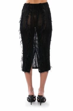 The AKIRA Label Its A Wrap Macrame Mesh Midi Skirt features a sheer, textured macrame mesh fabrication, a pull-on fit, vertical fringe stripe detailing, a bodycon midi silhouette, and a subtle back slit. Complete your set with the matching AKIRA Label Its A Wrap Macrame Mesh Sleeveless Mock Neck Top.