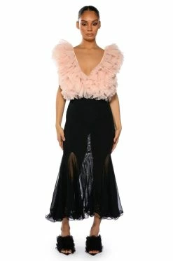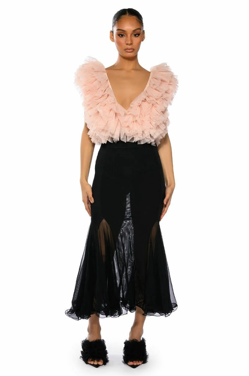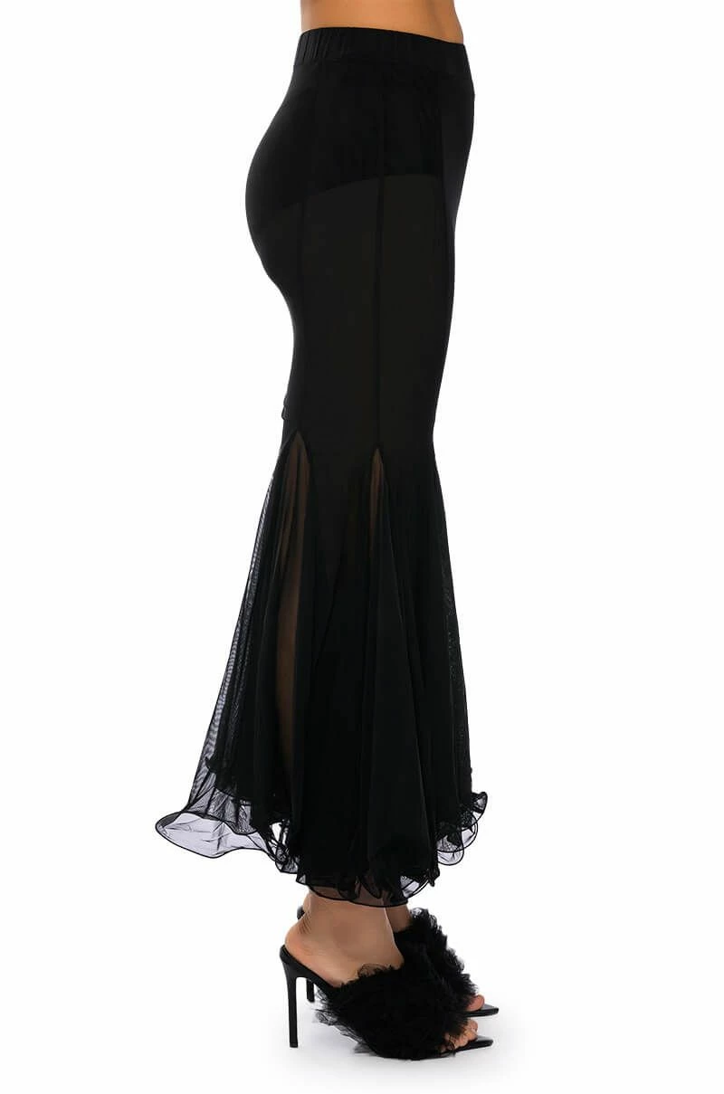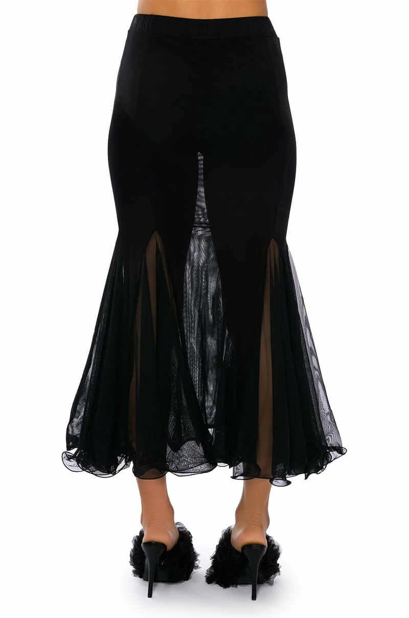 Set trends in The AKIRA Label Keep Up Mermaid Flare Mesh Midi Skirt. This sheer mesh piece features a wide elastic waistband, a midi length silhouette, a flattering flared mermaid hem, and a pull on fit.