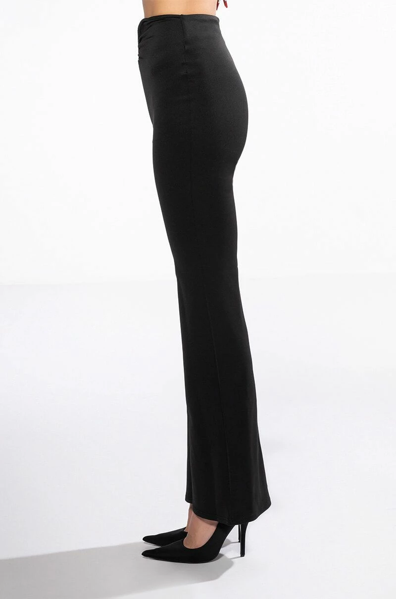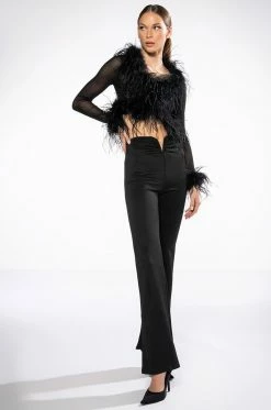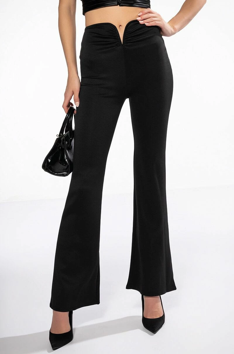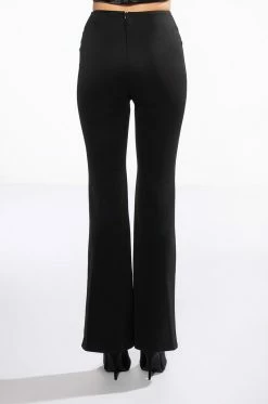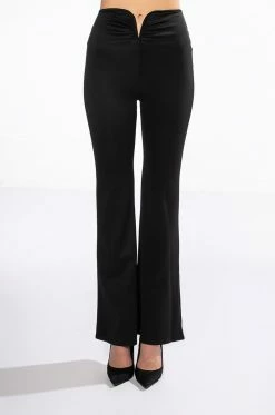 The AKIRA Label Know It All Curved Waist Flare Pants are made from a slick, stretchy fabrication and feature a high rise waist, a curved arch waistband with boning for structure, flared pant legs, and a tonal back zipper closure.