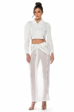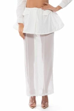 The AKIRA Label Layered Shirt Maxi Skirt is a unique 2-in-1 skirt made from a lightweight fabric and mesh base, featuring a high waist, ruched elastic waist at the back, and a layered mini skirt design with a long sheer maxi skirt underneath. Complete with faux front flap pockets, adjustable self-tie drawstring at the bottom hem of the mini skirt, a button down front closure, and a slip-on fit. Style with The AKIRA Label Feathers On My Mind Cropped Poplin Shirt With Feathers for a pop of color and platform slides for a flirty, chic look.