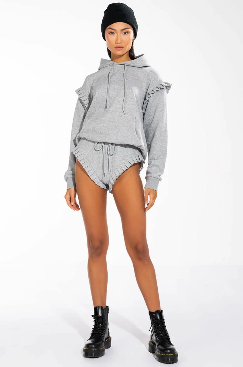 The AKIRA Label Lazy Dayz Ruffle Detail Booty Short is made from a soft sweatshirt fabrication and features a high rise waist with a ruched elastic drawstring waistband, pleated ruffled hems, and a sexy booty-hugging fit. Pair this piece with the matching AKIRA Label Lazy Dayz Ruffle Detail Oversized Hoodie and chunky sneakers to finish off your cozy cute athleisure look!