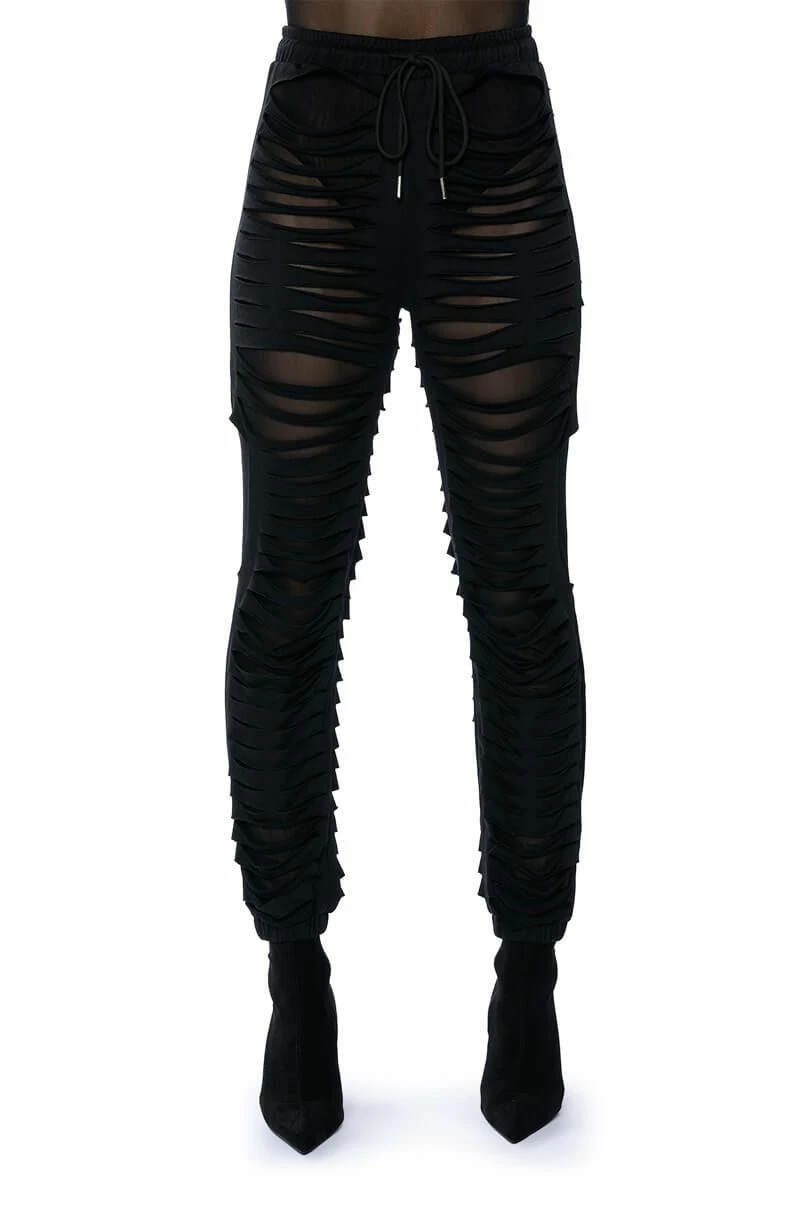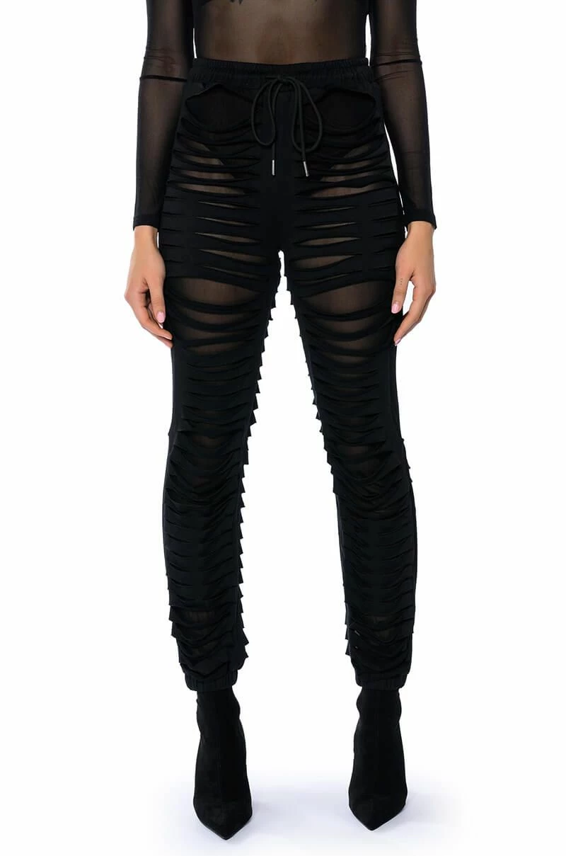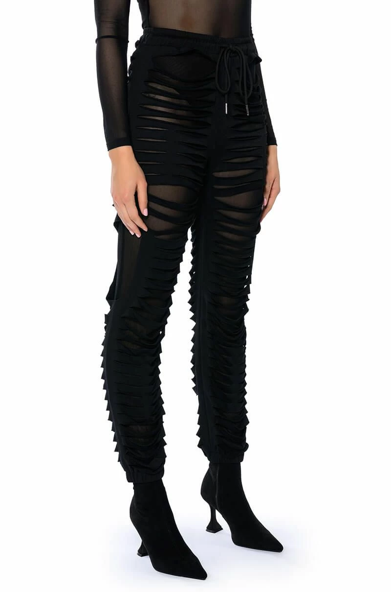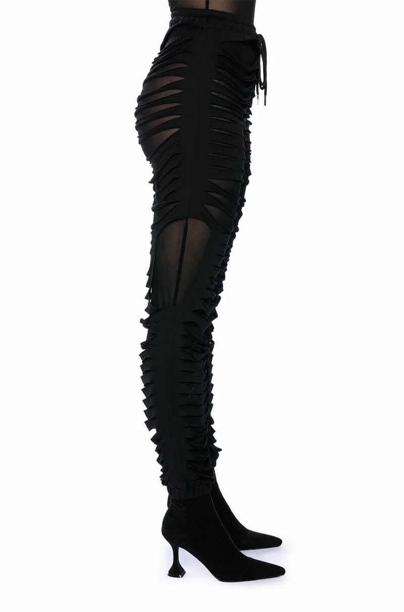 The Lennox Distressed Jogger is a sexy take on the classic jogger pants. Perfect for your new year’s wardrobe, these joggers are made with a mesh base fabrication and an overlay of distressed slit fabric. Complete with a drawstring elastic waistband, ruched elastic bottom hems, and a pull-on fit. Pair with a mesh long sleeve bodysuit and chunky shoes for a sleek athleisure look.