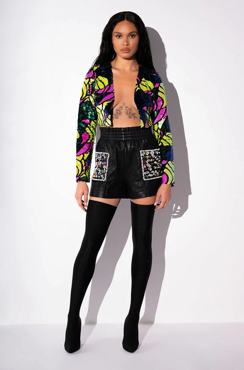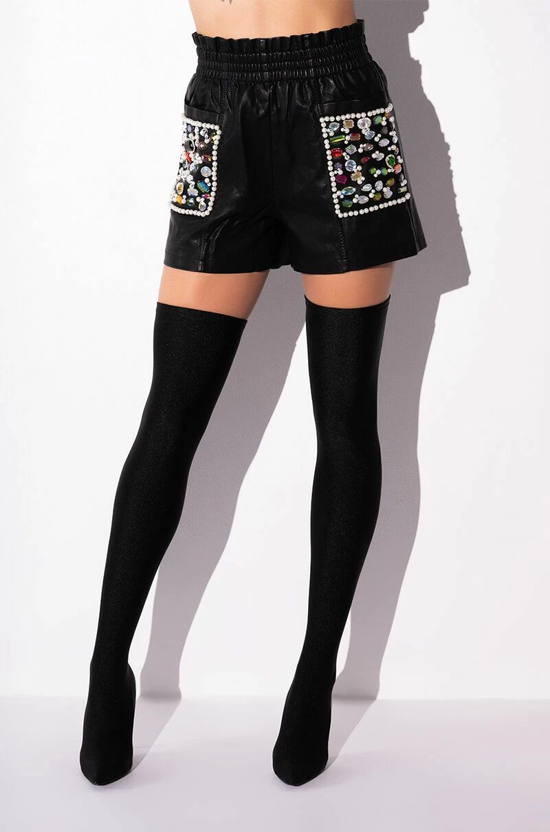 The AKIRA Label Lorie Gem Embellished Faux Leather Shorts feature a faux leather fabrication, a cinched elastic high rise waist, bead and rhinestone-embellished embellished front pockets. Complete with a faux front button detailing.