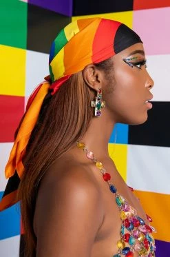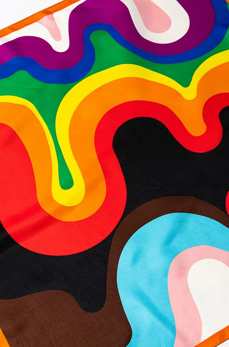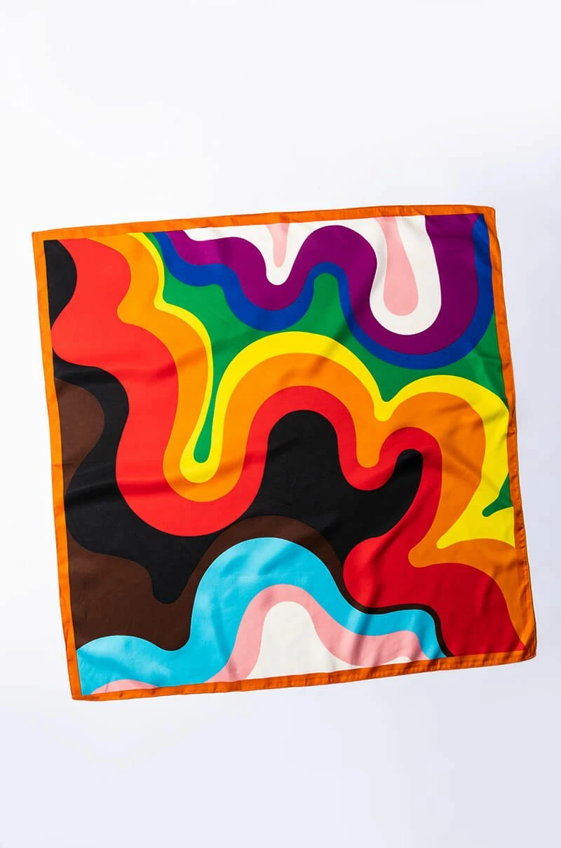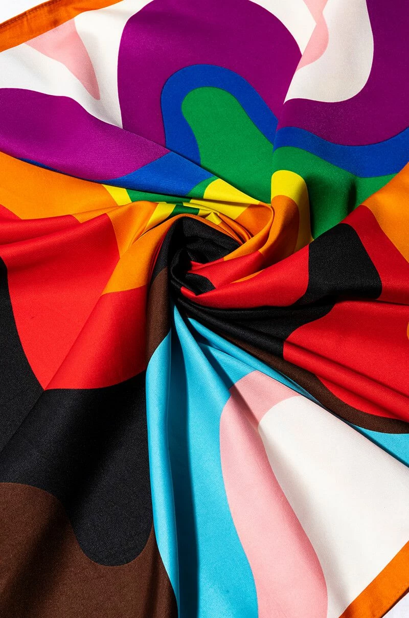 Everybody say love! The AKIRA Label Love Is Love Rainbow Scarf is made from a satiny fabrication and features an oversized square silhouette and an abstract print of mixed rainbow and pride colors. Wrap this bold piece around your neck or purse, or wear it as a top to show off your pride in style wherever you go.