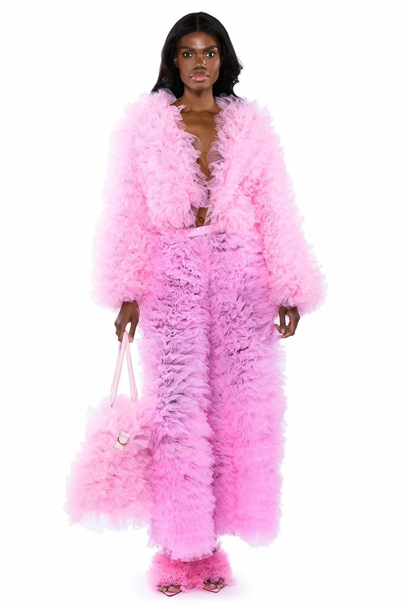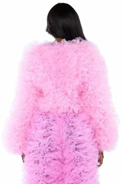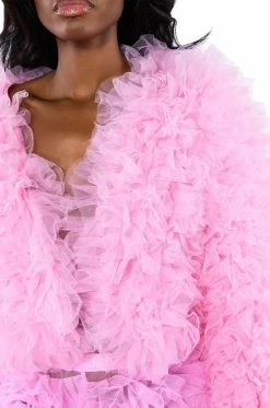 We’re falling for The AKIRA Label Love You Lou Lou Tulle Jacket In Pink! This ultra chic number is made from a mesh base fabrication, and features an all over luxe tulle design, long sleeves, an open front, cropped silhouette, and a smooth, satin inner lining. Pair with a baby tee, straight leg denim, and stiletto booties for an effortlessly glam look!