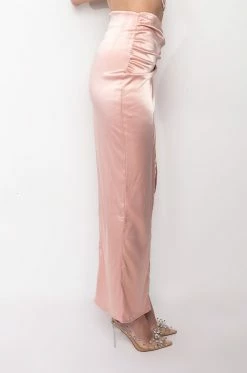 The AKIRA Label Modern Muse High Slit Satin Maxi Skirt features an asymmetrical waistline, a maxi length silhouette, and a glamorous satin base. Complete with pleat front detailing, an ultra-high front slit, and an exposed back zipper closure. Style this piece with the coordinating AKIRA Label Modern Muse Sleeveless Satin Bustier for a completely glamorous ensemble.