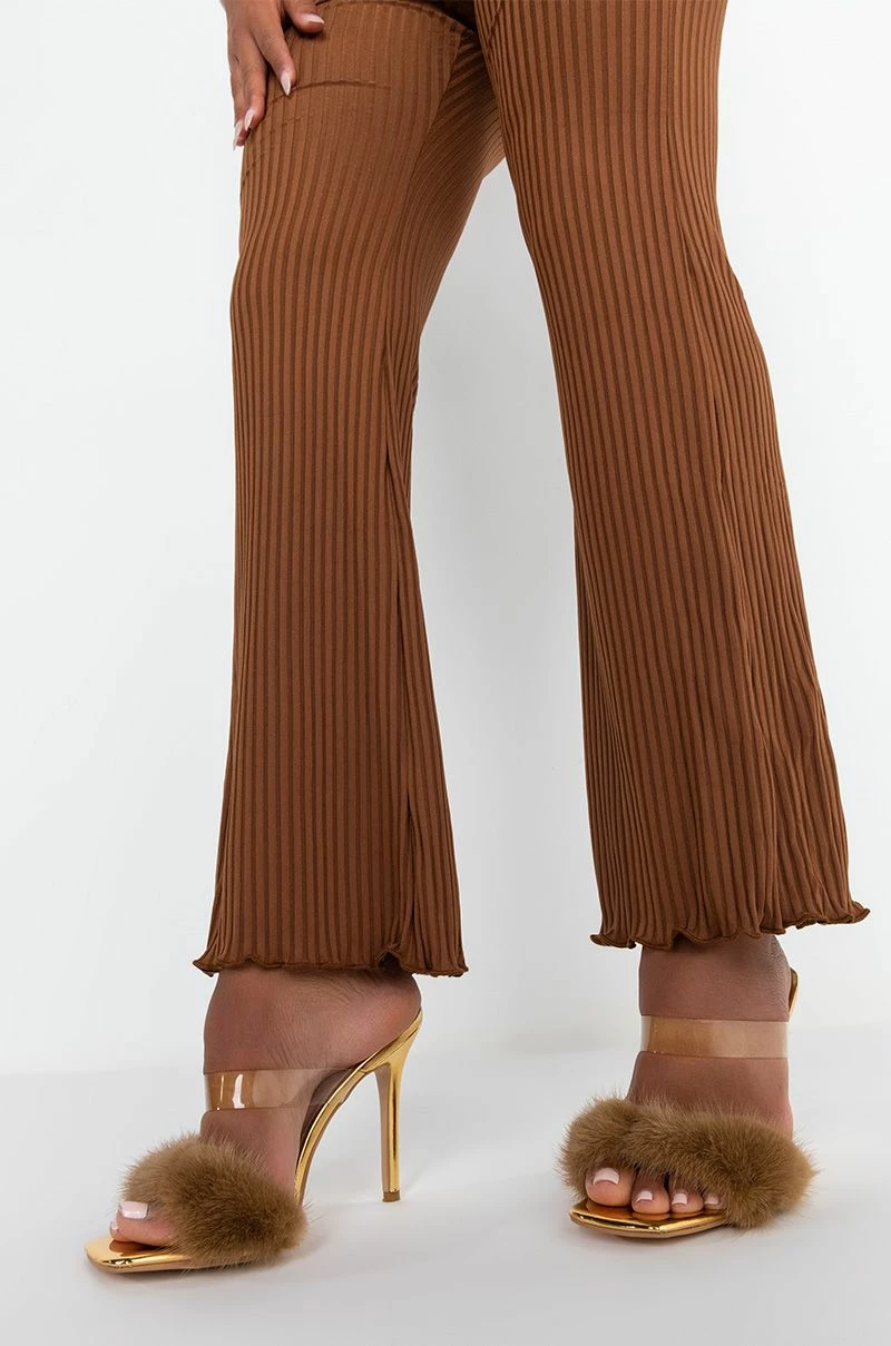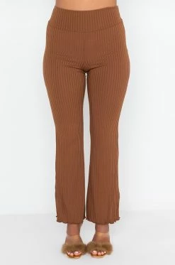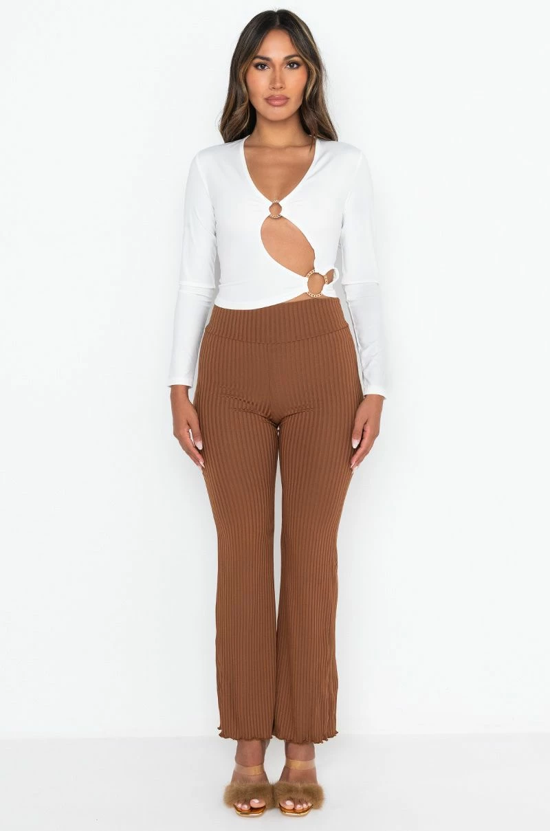 The AKIRA Label My Clarity Wide Leg Ruffle Pant is made from a ribbed fabrication, and is complete with wide pant legs, a lettuce trim hemline, and a stretchy high rise waistline.