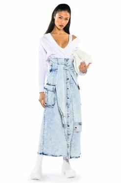 The AKIRA Label Next Up Bleached Denim Maxi Skirt is made from a bleached denim fabrication and features a frayed ultra high rise waist, cargo flap side pockets, a maxi length silhouette, and snap button front closures. Complete with mock denim jacket tie waist sleeve details.