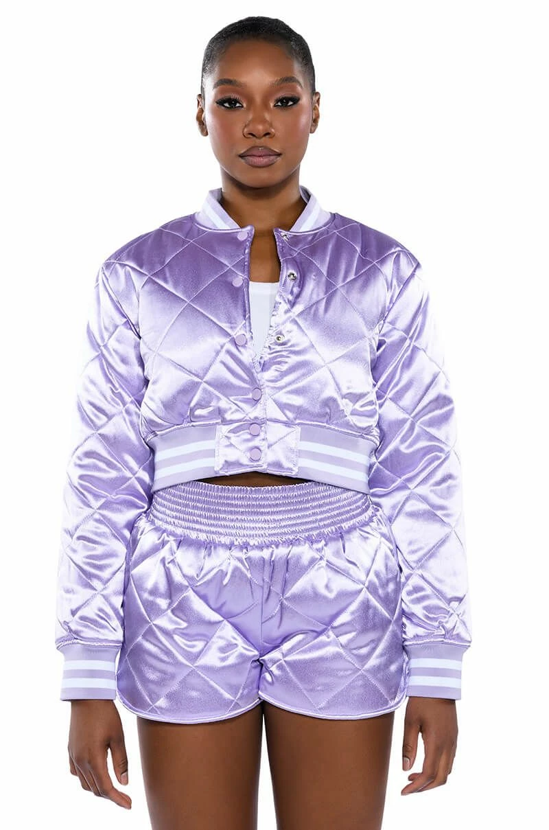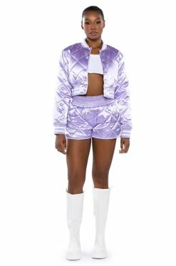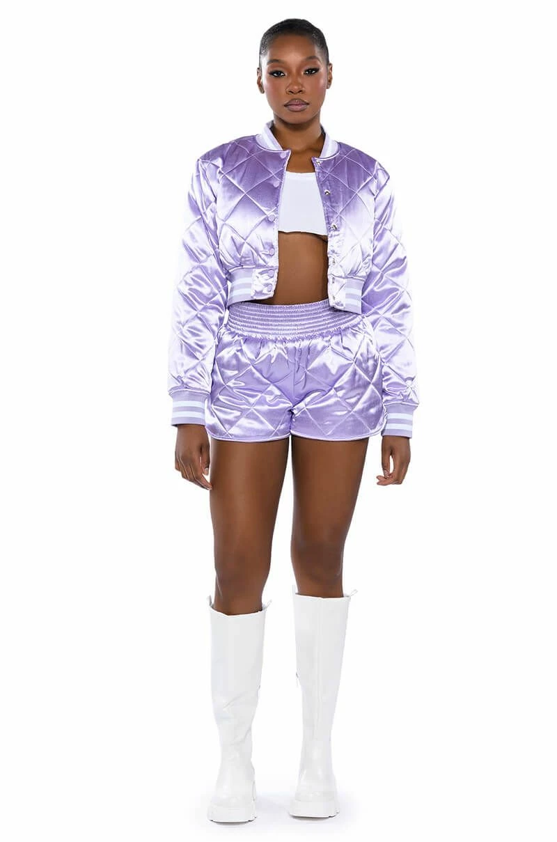 Dead ass the cutest, comfiest shorts you’ll ever own. The AKIRA Label No Cap Quilted Satin Dolphin Shorts in Lilac are a fresh take on the classic lounge short featuring a plush quilted satin fabrication, a cinched elastic high rise waist, and a dolphin short silhouette. Complete your look with The coordinating AKIRA Label No Cap Cropped Satin Varsity Bomber in Lilac.
