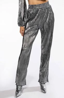 The AKIRA Label Noel Pleated Metallic Palazzo Pant is made from a pleated metallic fabrication and features a high rise waist, a shirred elastic waistband, a straight leg silhouette, lettuce trim hems, and a pull-on fit. Pair this piece with the matching AKIRA label noel pleated tie front metallic peplum blouse to complete your look.