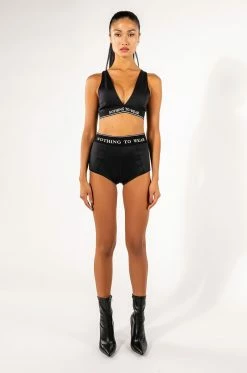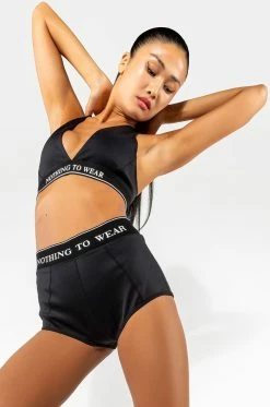 Lingerie saves the day! The AKIRA Label Nothing To Wear High Waisted Booty Shorts are a stretchy nylon blend tap pant featuring a bodycon base, a high rise waistline, an elasticized waistband with โNothing To Wear,โ graphic text print detailing, and a mini short length. Pair with the coordinating Nothing To Wear Bralette for a complete look.