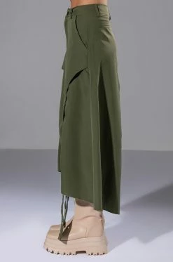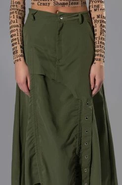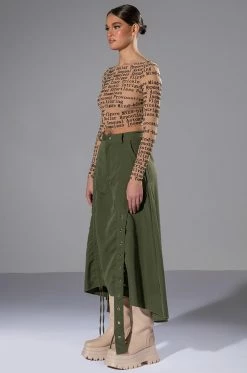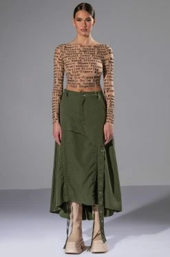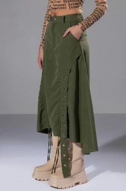 Weβre in LOVE with The AKIRA Label On The Go Cinched Olive Midi Skirt! Meet your girls at the first, second, and third location in this amped-up skirt, made from a sleek, light fabrication and featuring a high rise waist, slant side pockets, a layered design and adjustable hems with ruched side drawstring detailing. Complete with an overlaying faux belt strap, midi length, and back slit for mobility. Pair with combat boots and a tonal windbreaker for that gorpcore look.