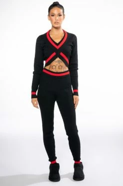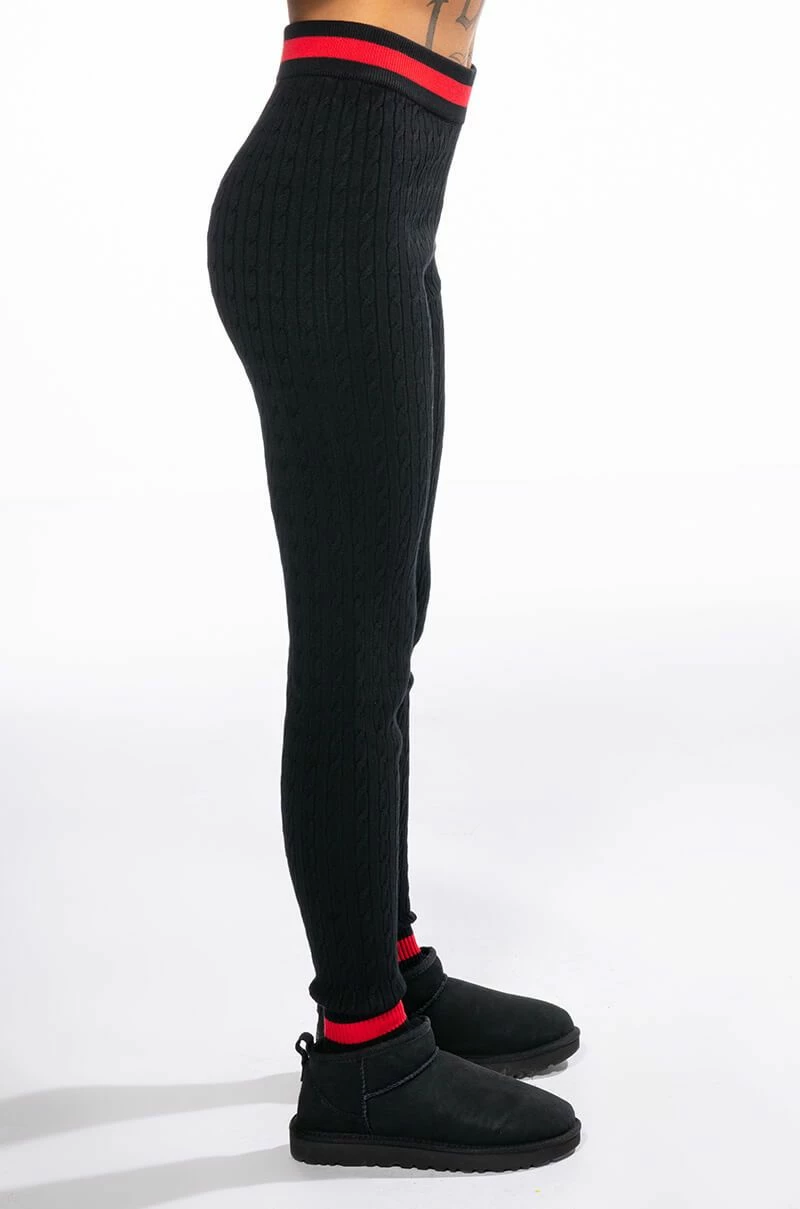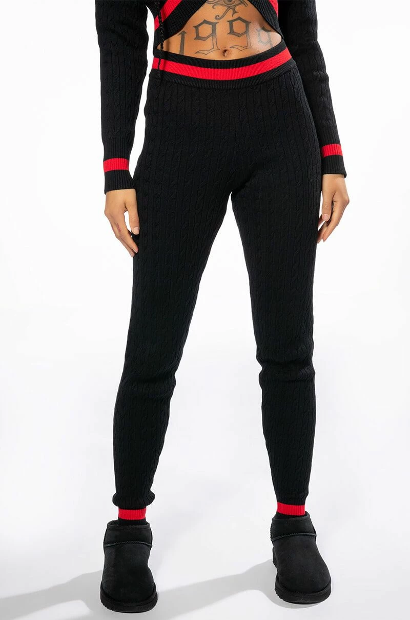 The AKIRA Label One Love Stripe Sweater Legging is made from a cable knit sweater fabrication and features a high rise waist with a striped ribbed knit elastic waistband, a skinny leg fit, striped ribbed knit knit ankle hems, and a pull-on fit. Pair this piece with the coordinating AKIRA Label One Love Stripe Sweater Crop Top to complete your look.