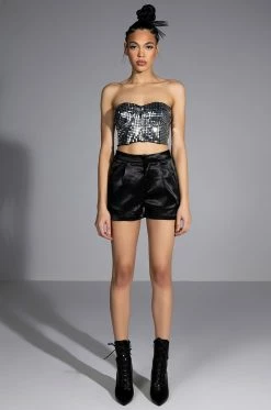 The AKIRA Label Passione Satin Shorts feature a slightly stretchy satin fabrication, a high rise silhouette, a pleat front design, on seam side pockets, and a hook and eye front zipper closure. Pair with the coordinating AKIRA Label Passione Satin Blazer for a complete look.